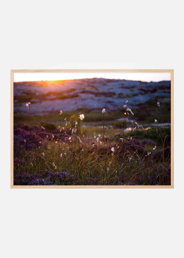 Един красив плакат със сцена на диви цветя, осветени от червената светлина на залязващото слънце. Треви и камъни сияят, когато слънцето залязва над върха на планината, създавайки топлина в тази лятна вечер. Представи си пикник в този красив пейзаж.
