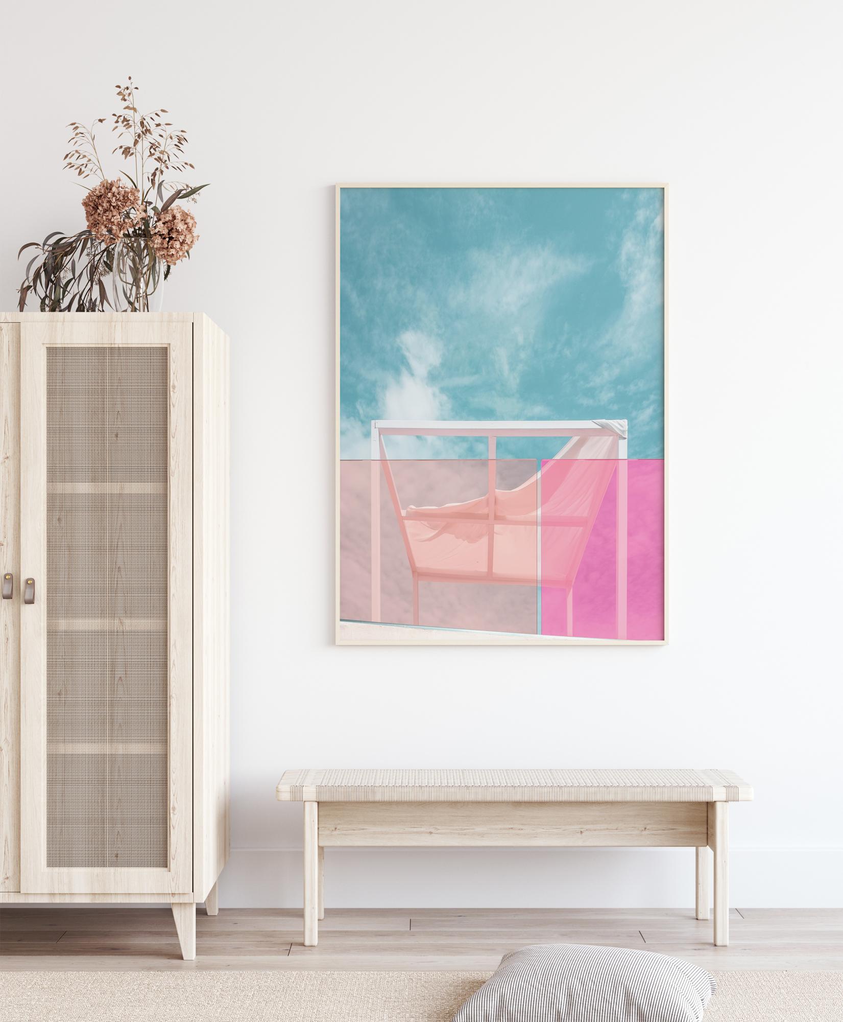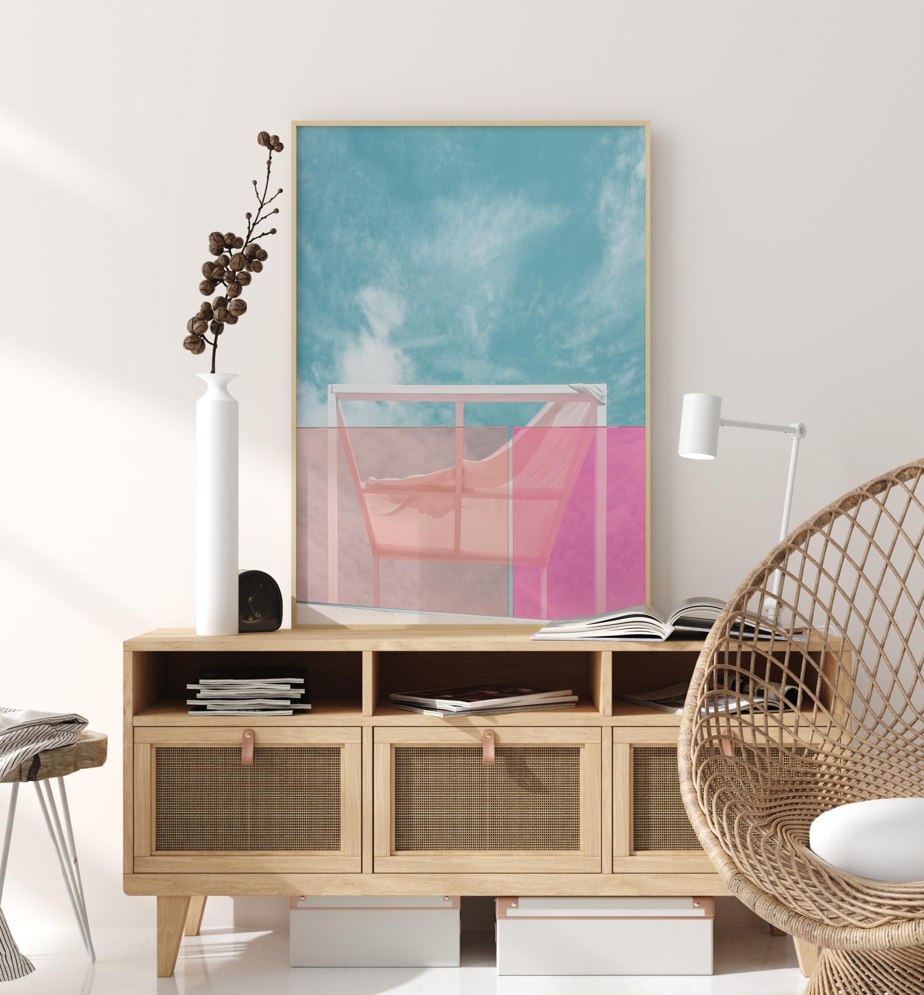 Един цветен постер с лятно небе и соларен покрив. През розовите стъкла на балкона може да се види бялото покривно поле и меките бели облаци на синьото небе. Представете си да се излежавате на слънце тук, на покрива, в топъл летен ден.