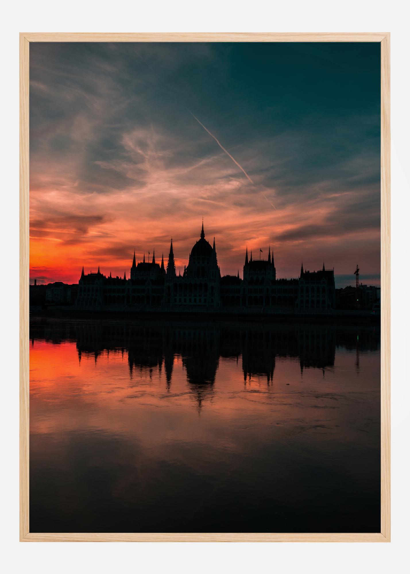 Плакат на залез слънце с град, който гледа към голяма водна площ. Силуетът на градските кули се отразява силно в водата. Зад тях свети невероятен червен залез, който озарява небето и хвърля драматично осветление върху водата и града.