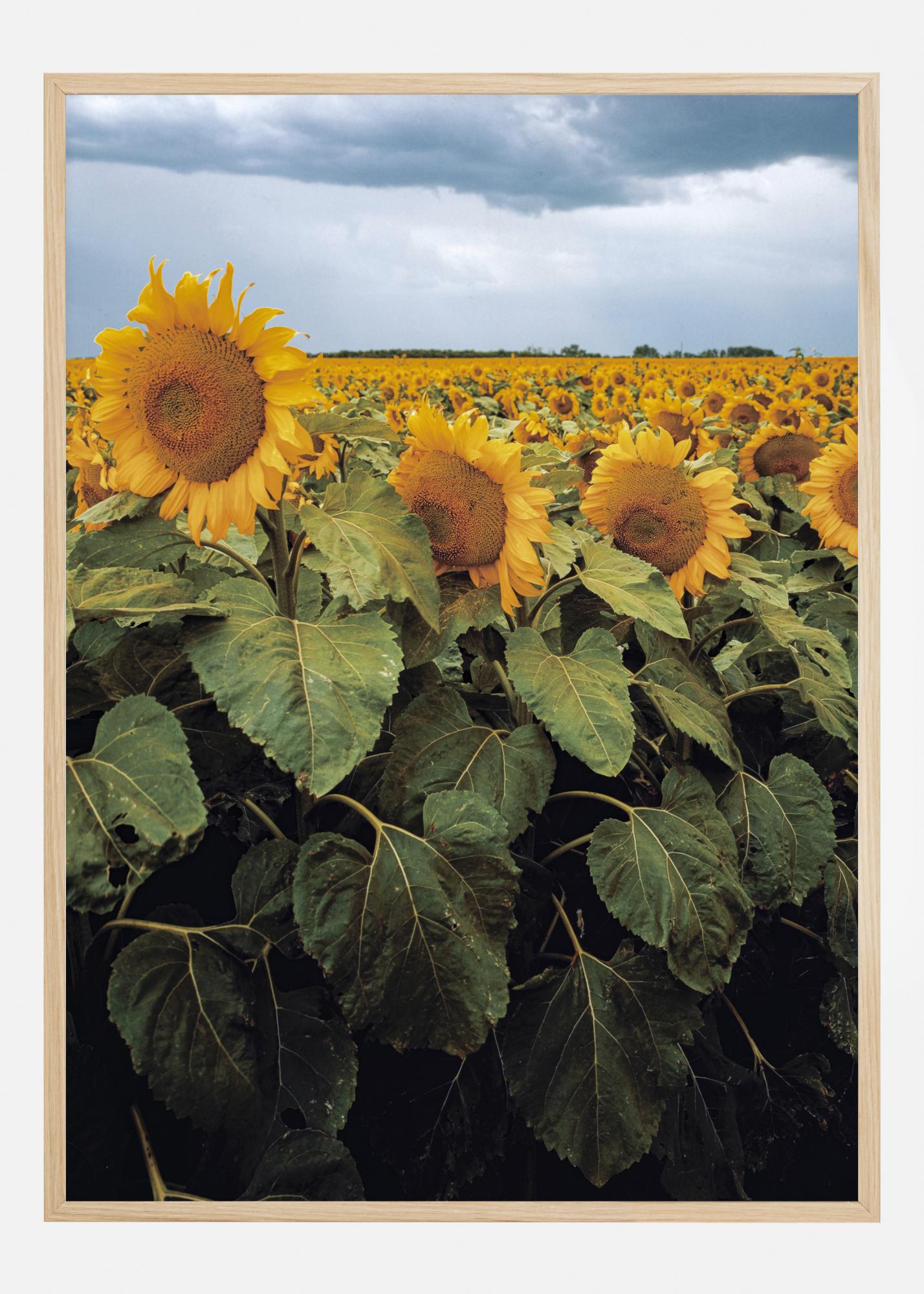 Ослепителен постер с голямо поле от слънчогледи. Изображението е изпълнено с дългите зелени стъбла и листа на цветята. Най-отгоре се носи море от светложълти слънчогледи, които се простират към далечината и синьото небе. Почувствайте се въодушевени с този радостен печат.
