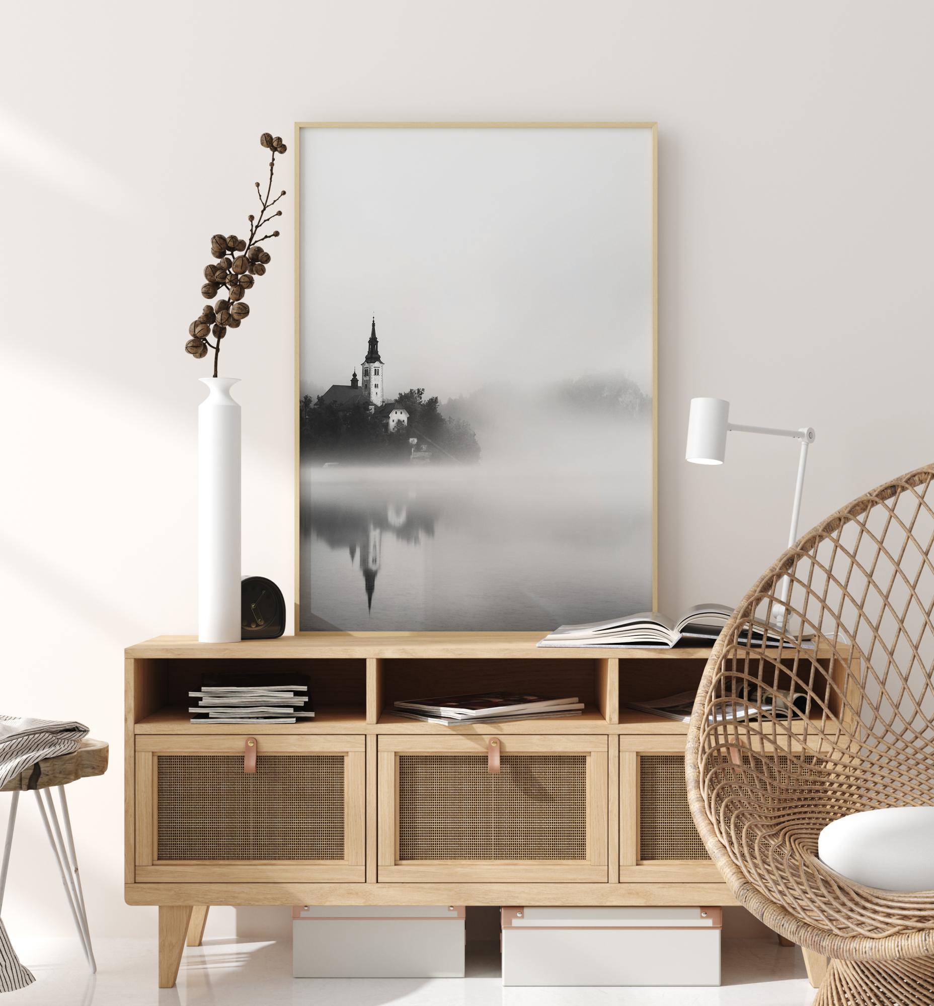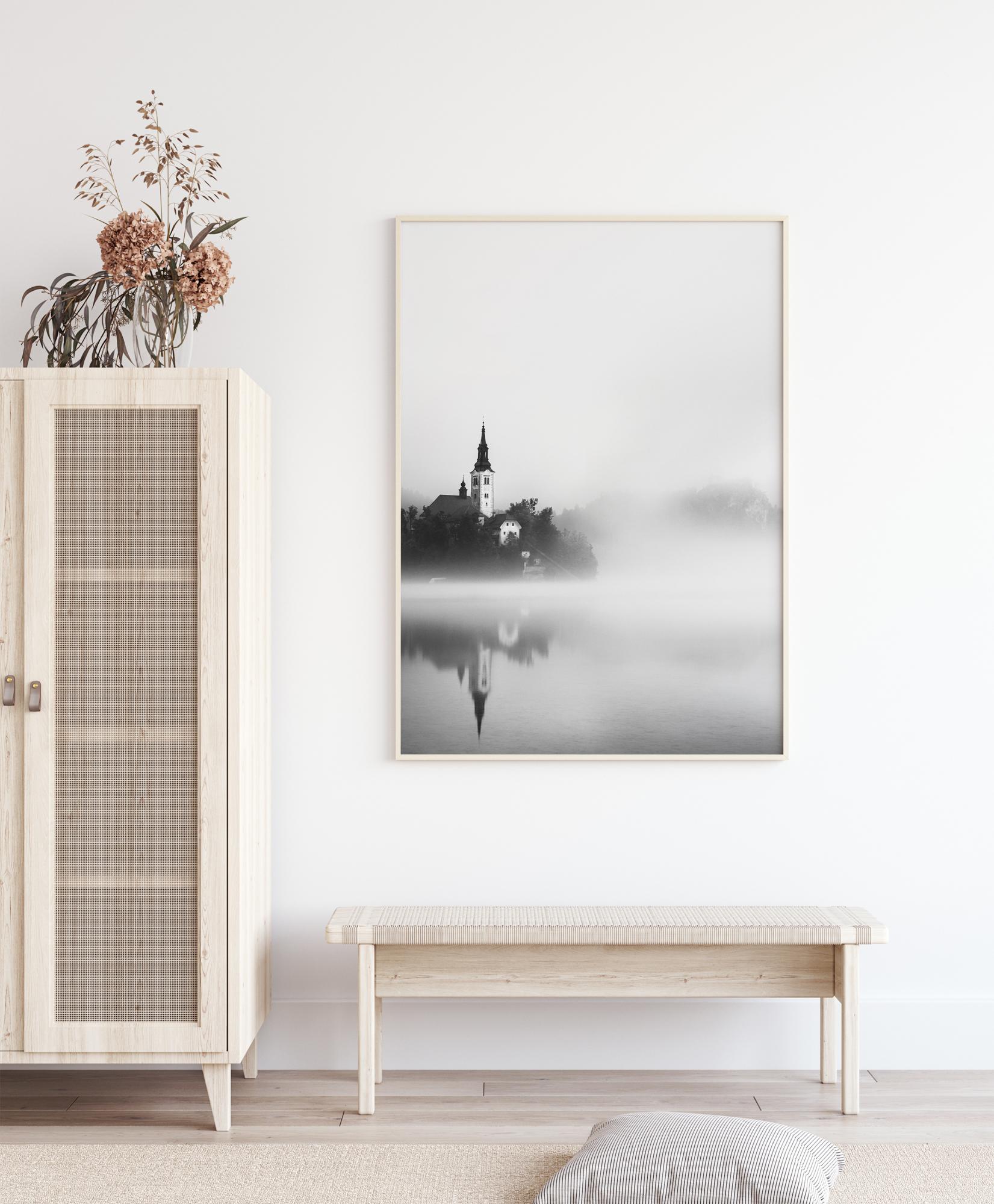 Религиозен постер с бяла църква край езеро. Тази черно-бяла снимка има мистичен характер. Езерото е покрито с мъгла, когато слънцето изгрява. Църквата изпъква от мъглата с ясни линии, които контрастират срещу мъглата.
