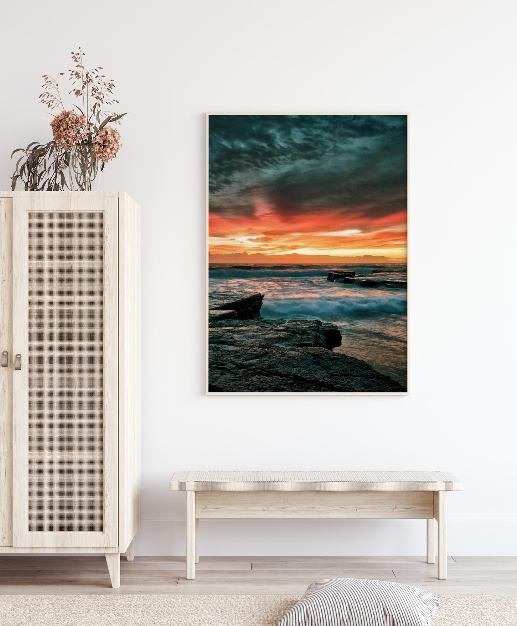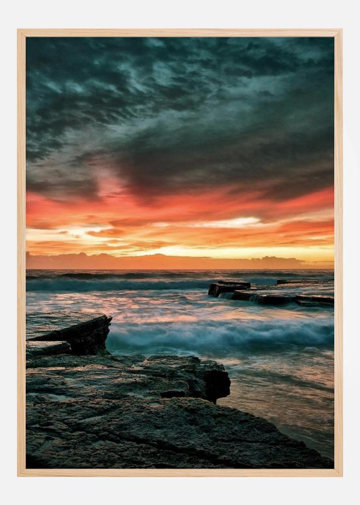 Епичен плакат със залез над вода. Вълните от морето се удрят в плоската скалиста крайбрежие. Тъмни облаци лежат точно отгоре с ярко червен залез ниско на хоризонта, което създава драматичен и впечатляващ образ, който ще задържи вниманието ви.