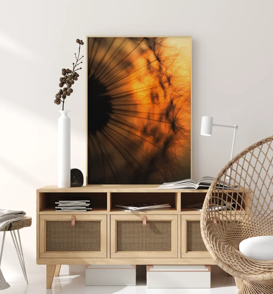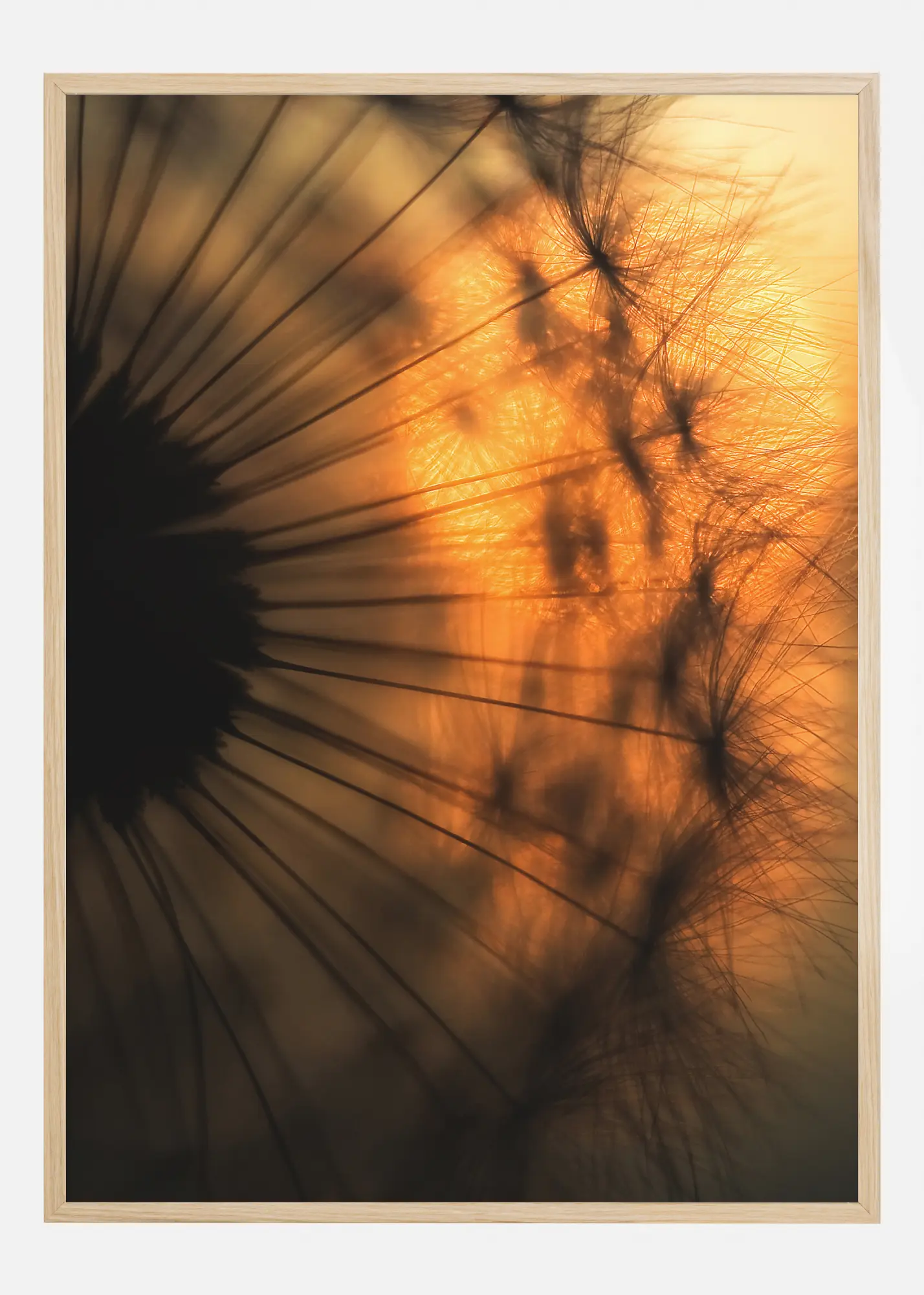 Близък план на постер, изобразяващ глухарче със светлорозов залез, който се процежда. Светлооранжевите тонове на слънцето са омекотени от голямата глава на глухарчето, която отразява масивната форма на слънцето, която едва се вижда през семената в този епичен печат.