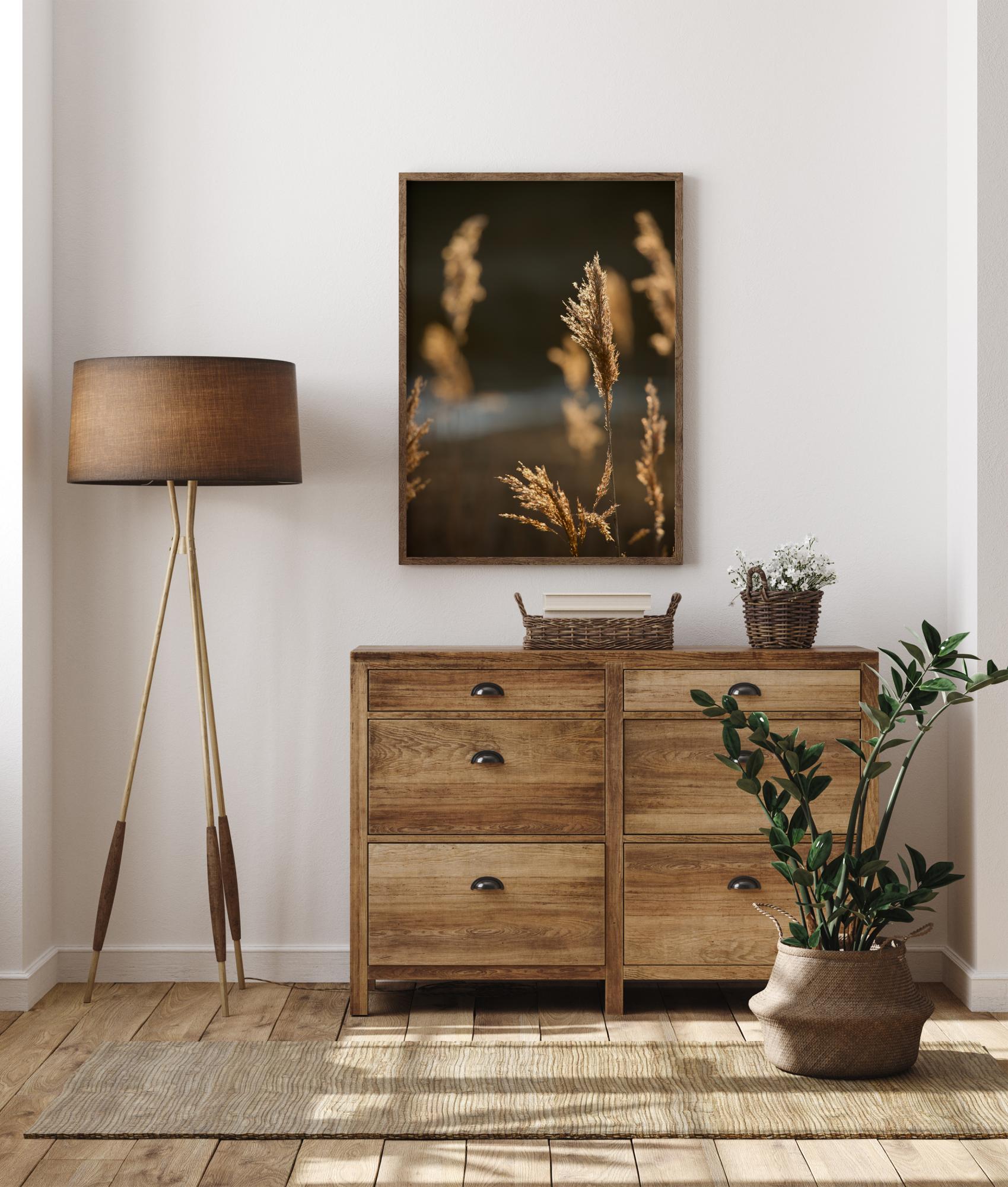 Летен плакат със слънце на поле. Близък план на тревички, които се люлеят в летен бриз. Те улавят златната светлина на слънцето, която също блести върху отдалечената река. Насладете се на този обгърщащ и мек образ, който носи лятото у дома ви, когато го окачите тук.