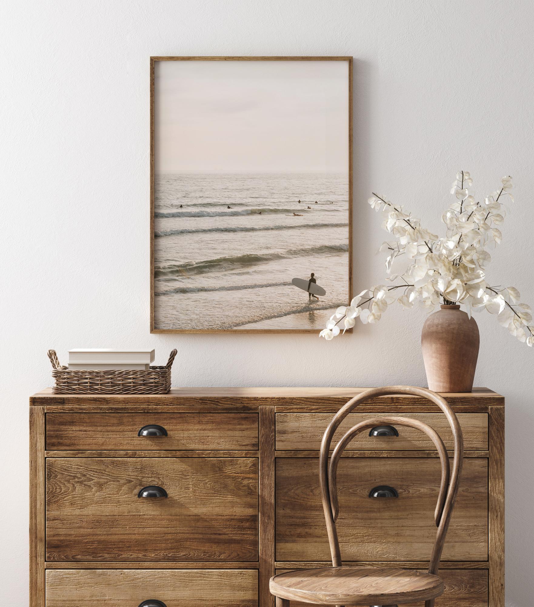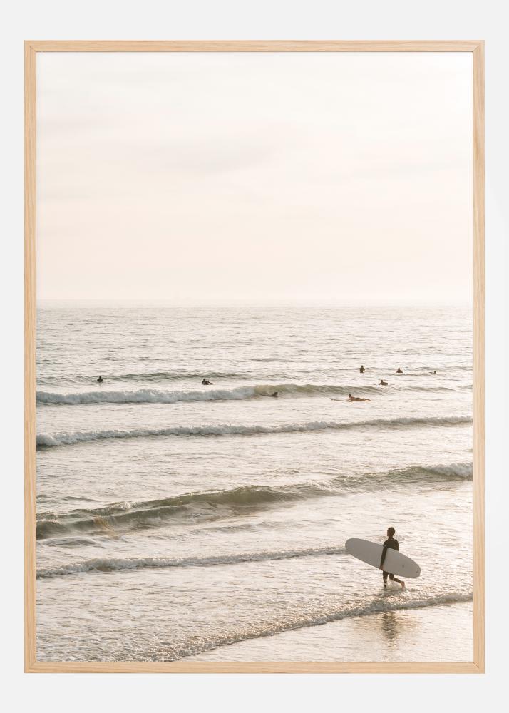 Плакат с обширно море, пълно със сърфисти, които очакват следващата голяма вълна. Малки глави се люлеят далеч в морето и последният сърфист върви сред вълните със своята дъска. Морето е спокойно в меката утринна светлина и има чувство на очакване във въздуха.