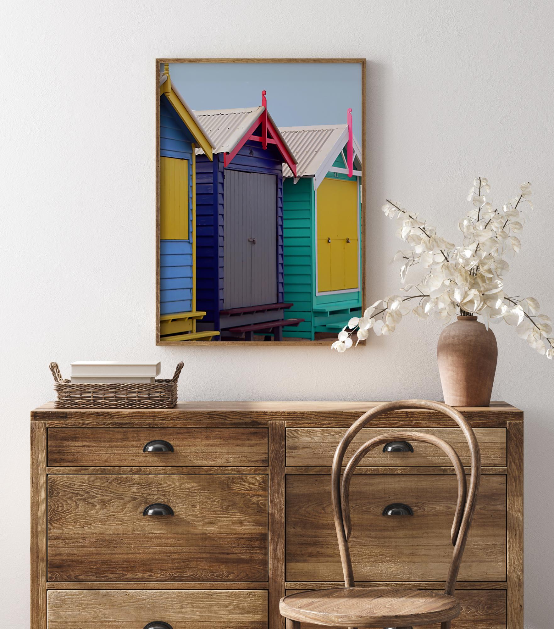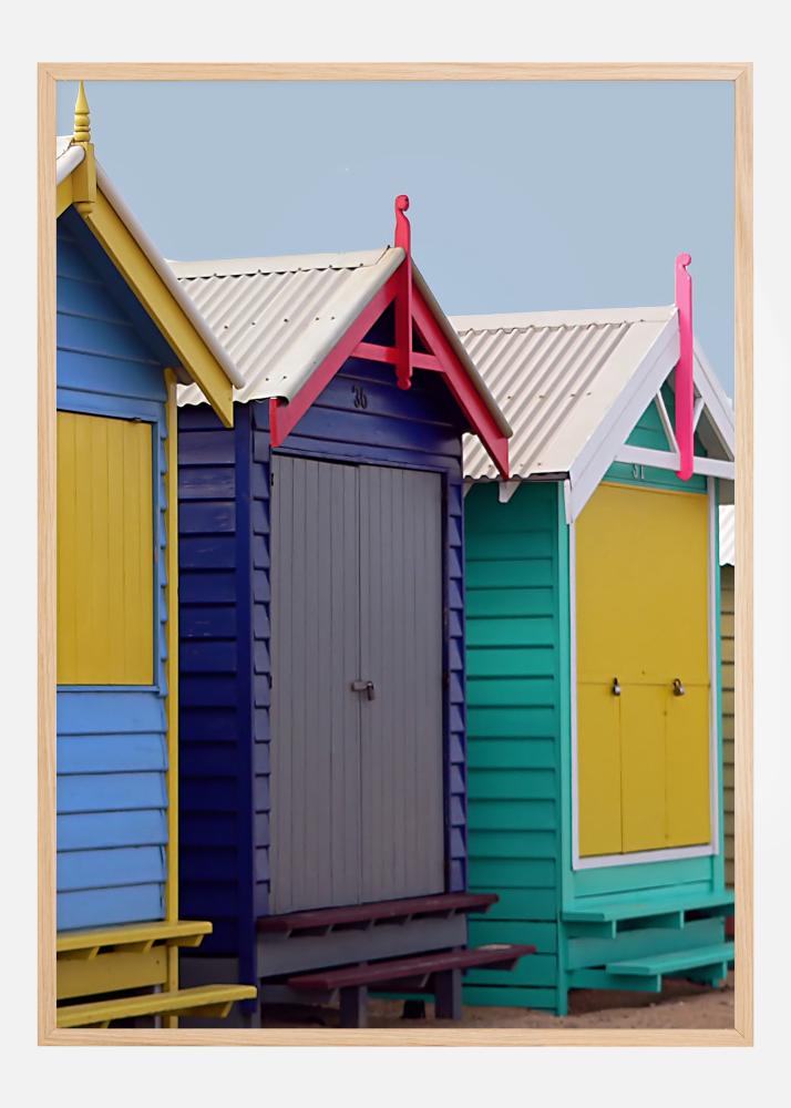 Светъл постер с цветни плажни хижи. Всяка хижа е боядисана в няколко жизнерадостни цвята, като жълто, синьо, розово и тюркоаз. Почувствайте лятното плажно усещане, когато окачите тази на неутрална стена и добавите цвят в дома си.