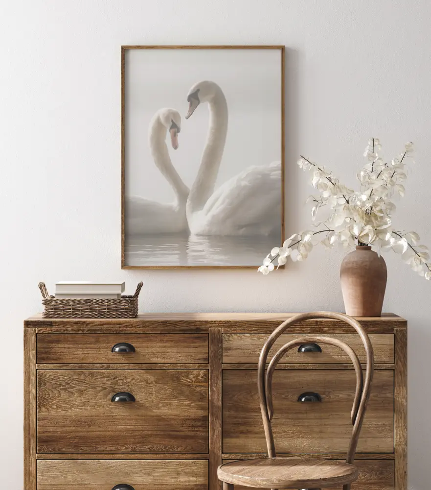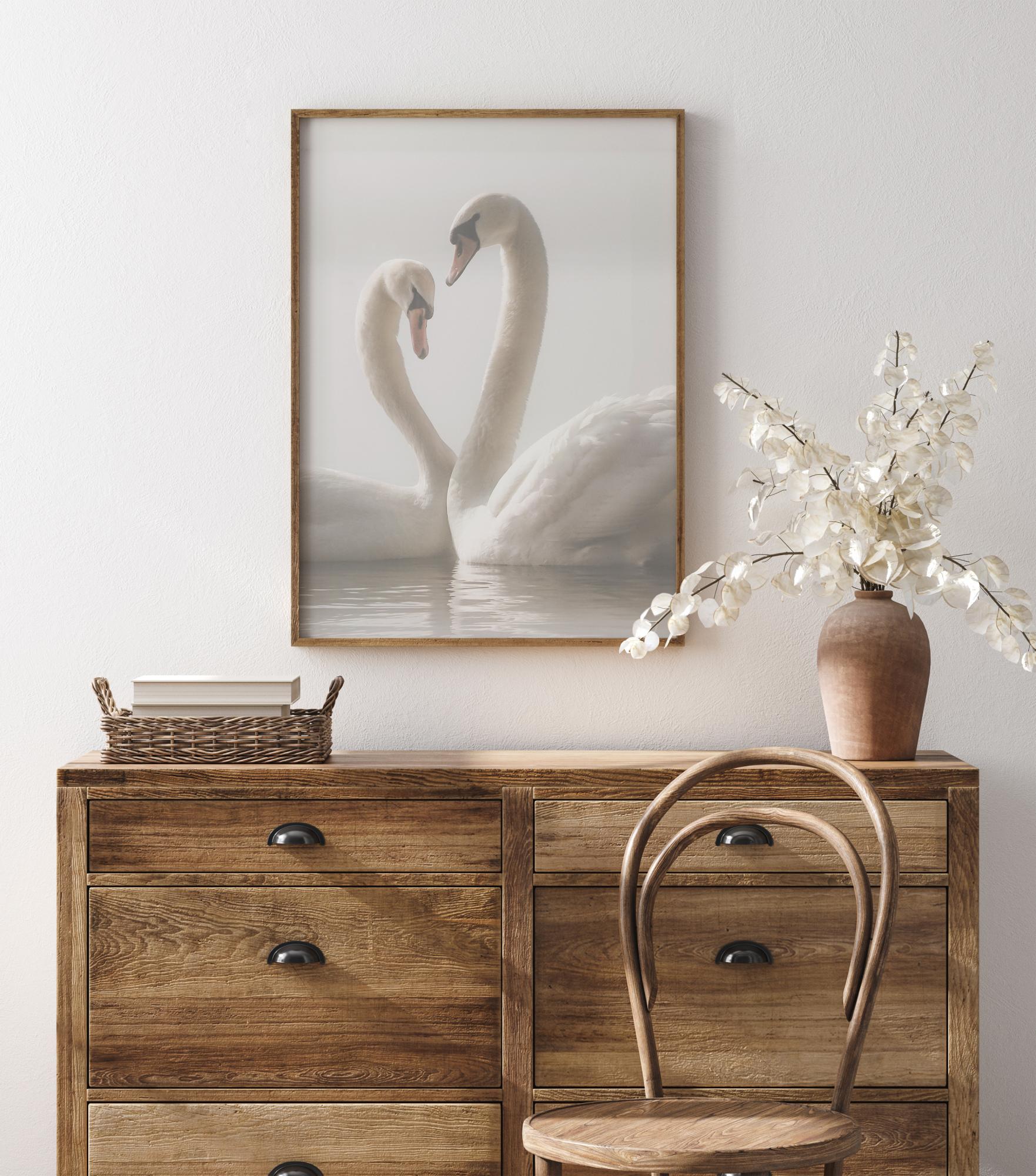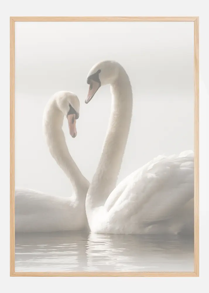 Романтично плакат с два лебеда, които плуват заедно. Нежното осветление придава хармонично спокойствие на този образ, където лебедите се плъзгат един към друг. Техните шии се вдигат и създават форма на сърце. Почувствайте любовта в тази очарователна снимка.