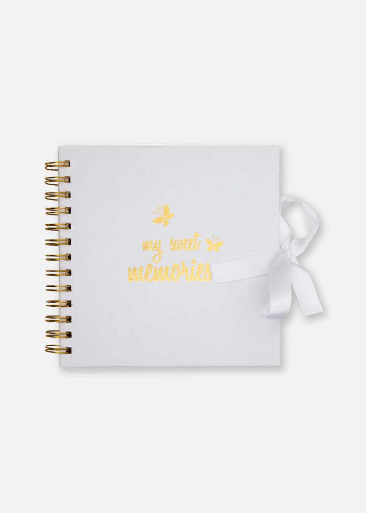 Един сладък спирален албум, който можете да затворите с помощта на бели ленти. Перфектен албум да съхранявате всички ваши най-красиви спомени! На предната част е отпечатан текстът "My sweet memories" със златни букви, заобиколен от пеперуди. Албумът съдържа 24 бели листа без киселини.
