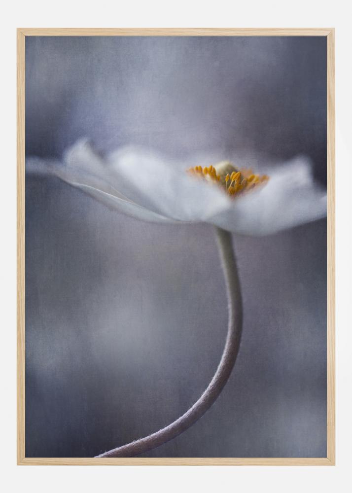 Постер с цветя с близък план на бяло цвете на мек сив фон. Оранжевият център на цветето изпъква на фона на приглушения фон, създавайки ясен фокус и подчертавайки красотата на цветето както отвътре, така и отвън. Тя е ефирна и магическа и излъчва спокойствие.