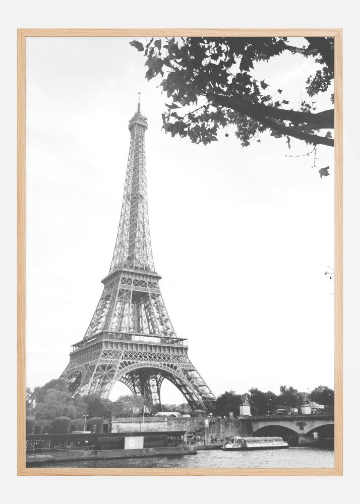 Постер на град с Айфеловата кула в Париж. Сивата кула се вижда ясно на фона на бяло небе. Долу се вижда животът и движението на реката с лодка и мост. Клон на дърво почти закрива върха на кулата в тази проста, естествена картина на този иконичен паметник.