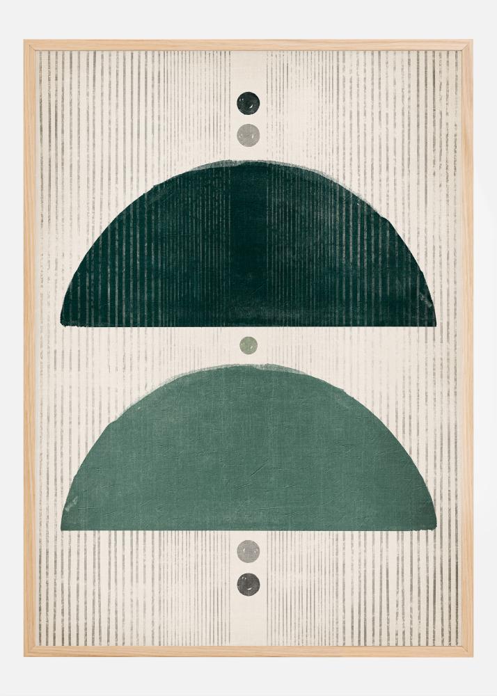 Този постер е повече от просто декоративно изображение; той е съвременно художествено тълкуване, което обединява естественото със стилизираното. Трите кръгли форми, центрирани между полукръговите блокове, функционират като фокусна точка, която събира цялата композиция. Тази принт може да служи като елегантен декоративен елемент на стена в минималистичен дом или офис, а успокояващите зелени тонове биха донесли усещане за природа и спокойствие в която и да е среда.