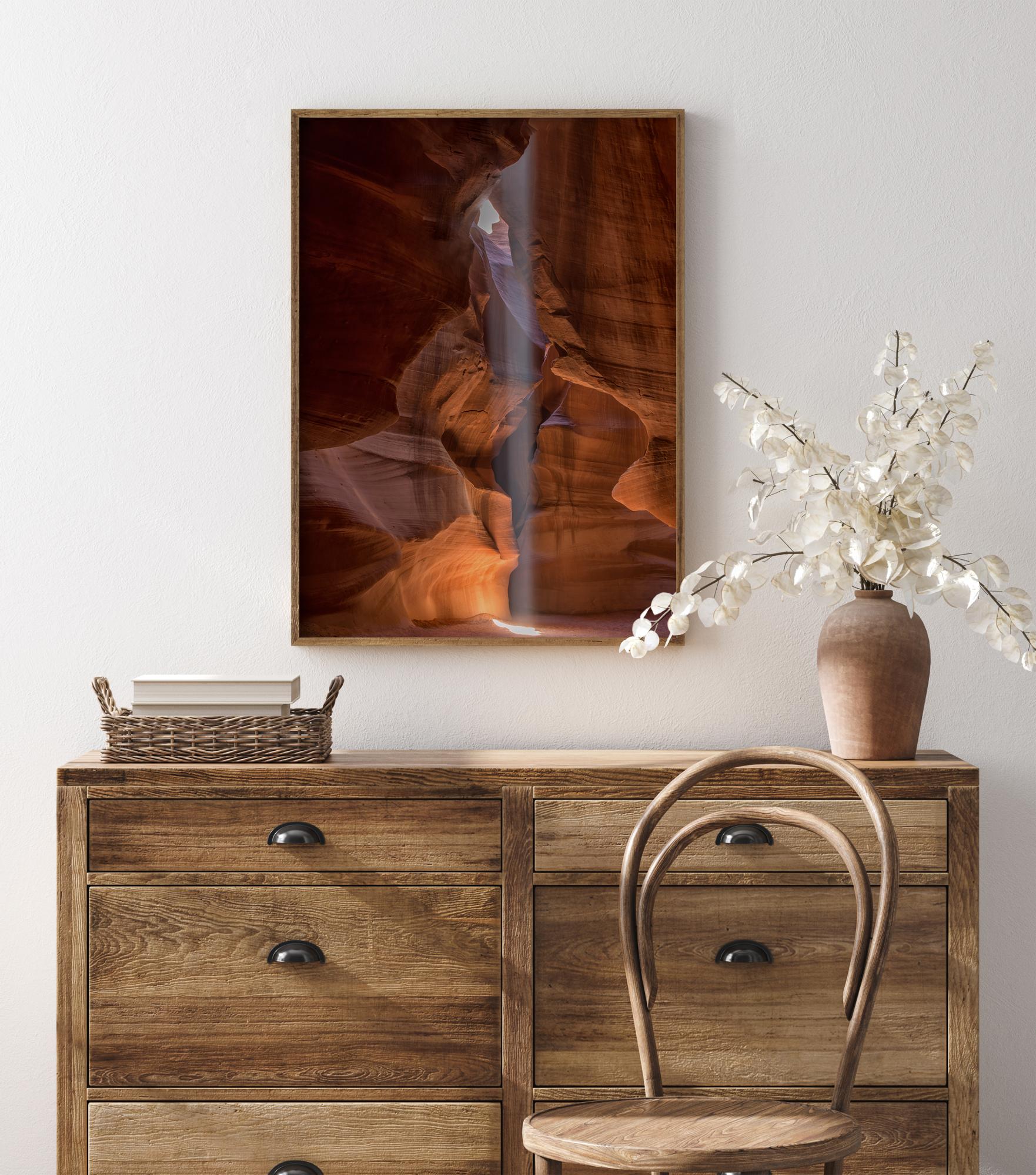 Магически постер с лъч светлина, който се спуска надолу през червени скали. Меките извивки на червените скали създават топло сияние. Единственият лъч светлина придава магическа атмосфера на тази затворена стая и допълнително осветява меките скали. Вземете това произведение у дома за драматично допълнение към вашия дом.