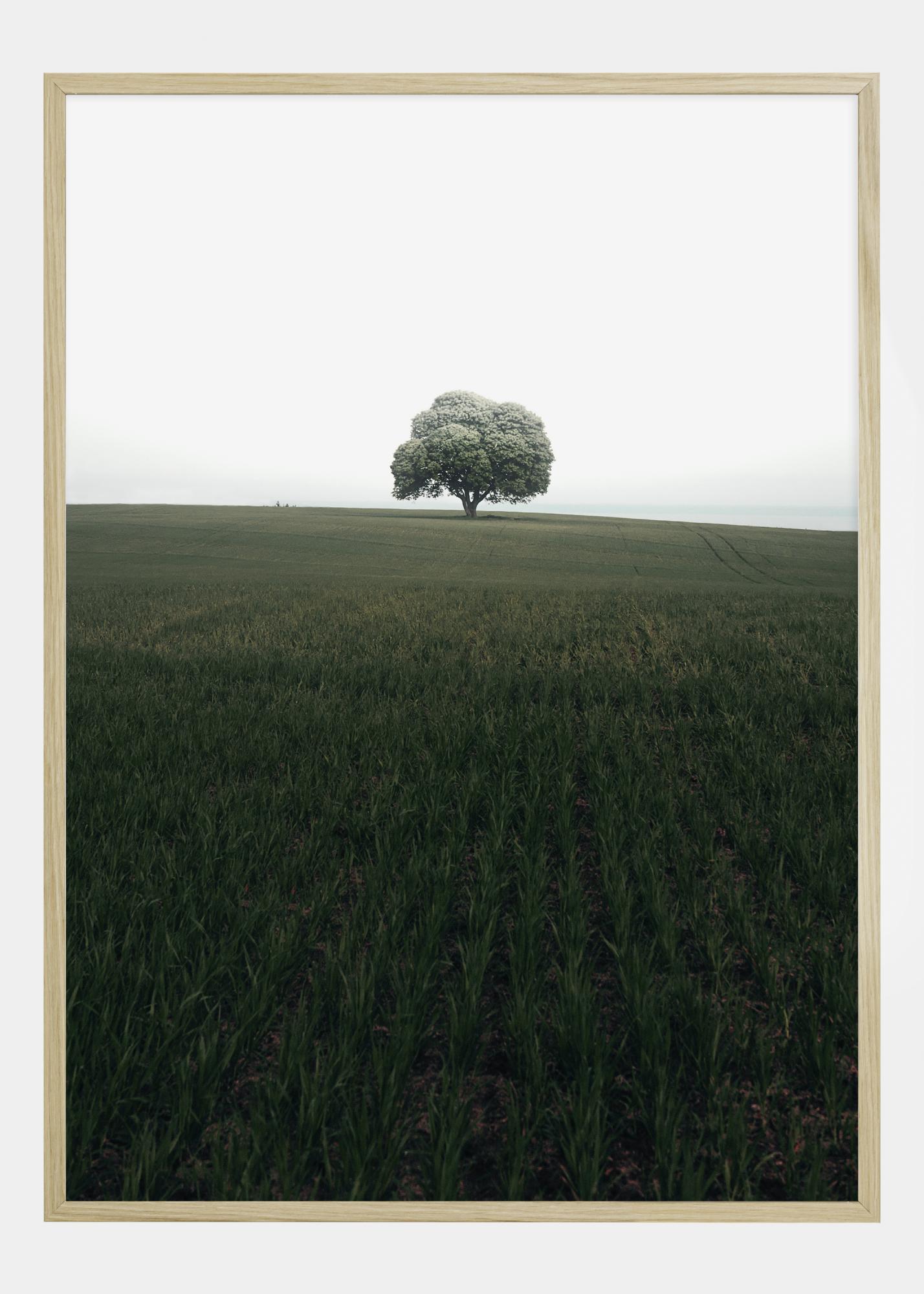 Този постер представя самотен дъб, който се издига от плодородно поле, със мека мъгла, която обгръща пейзажа. Величествената форма на дървото стои като естествена скулптура срещу меката светлина, което създава силен визуален контраст с линейните шарки на посевите на преден план. Общият зелен тон е допълнен с нюанси на топло кафяво и фини червени тонове, което добавя дълбочина и сложност на изображението.