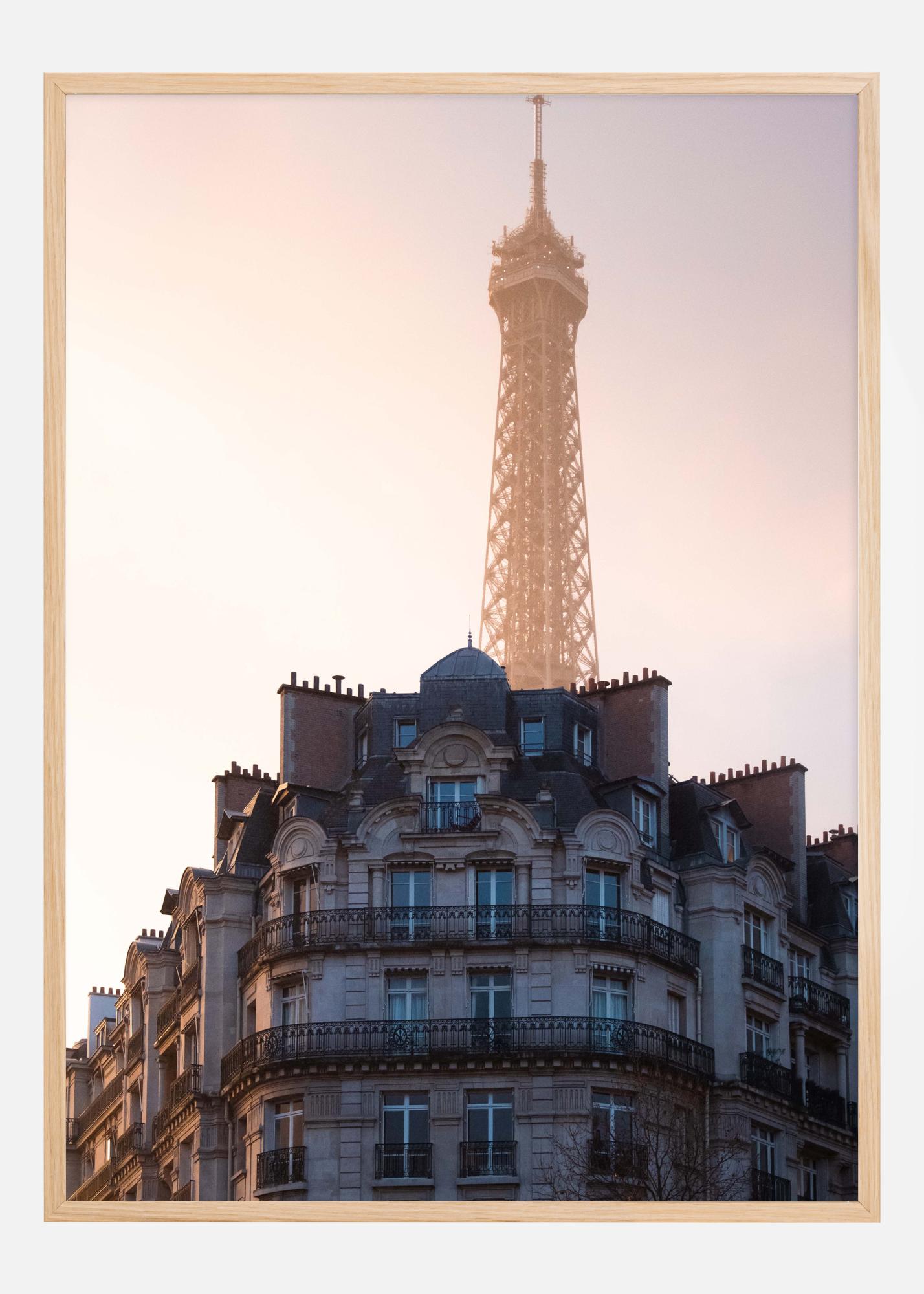 Този постер улавя същността на Париж с романтичното и омагьосващо изображение на Айфеловата кула, която срамежливо се показва зад класически парижки сгради в стил Осман. Топлите тонове на залеза създават мека фонова, където пастелните цветове на небето придават усещане за мечтателно спокойствие. Естествените цветове на този печат придават усещане за елегантност и простота и го правят перфектно допълнение към всяка стая, която има нужда от финален щрих на световна култура.
