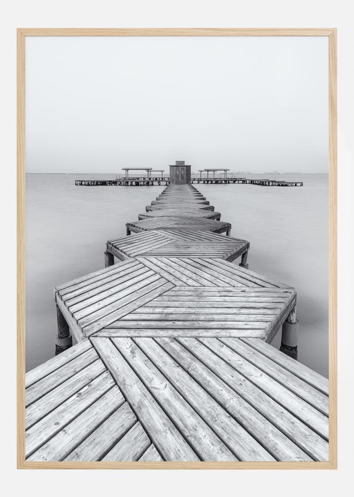 Забавен постер с шестоъгълен кей, който се движи към далечината над спокойното езеро. Изображението е в приглушени сиви тонове, които го правят да изглежда по-скоро студено, отколкото топло. Дървеният кей те води навън в далечината, където има мостче, което те очаква. Комбинирайте с ярък цвят, за да придаде топлина.