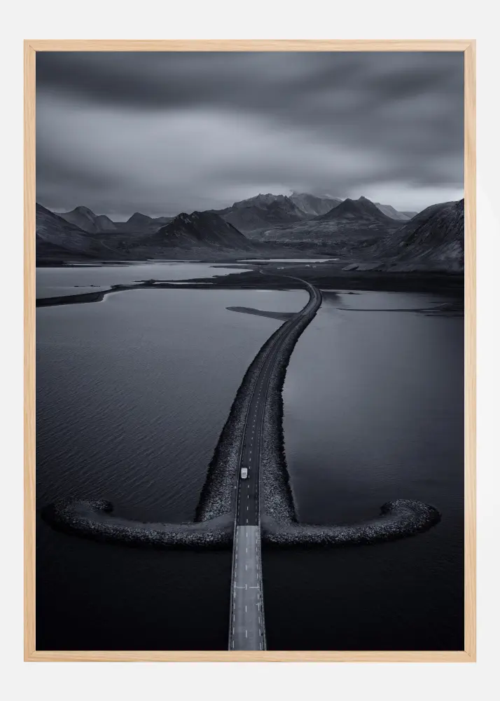 Плакат в сиви тонове с широк път, който минава през езера и влиза между планините на заден план. Сиво облачно небе виси отгоре. Една единствена бяла кола се движи по пътя към далечината. Комбинирайте със светла стена, за да придадете малко цвят на тази строга картина.