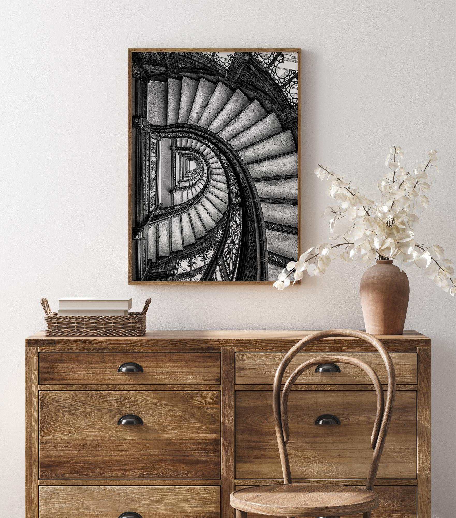 Интериорен постер със серия от спираловидни стълби, които се извиват надолу до дъното на сградата. Виждани отгоре, стълбите се завъртат около себе си. Парапетите от ковано желязо са детайлни и изпъкват срещу простите стъпала. Контрастните тонове придават дълбочина на произведението, когато погледът е привлечен чак до дъното.