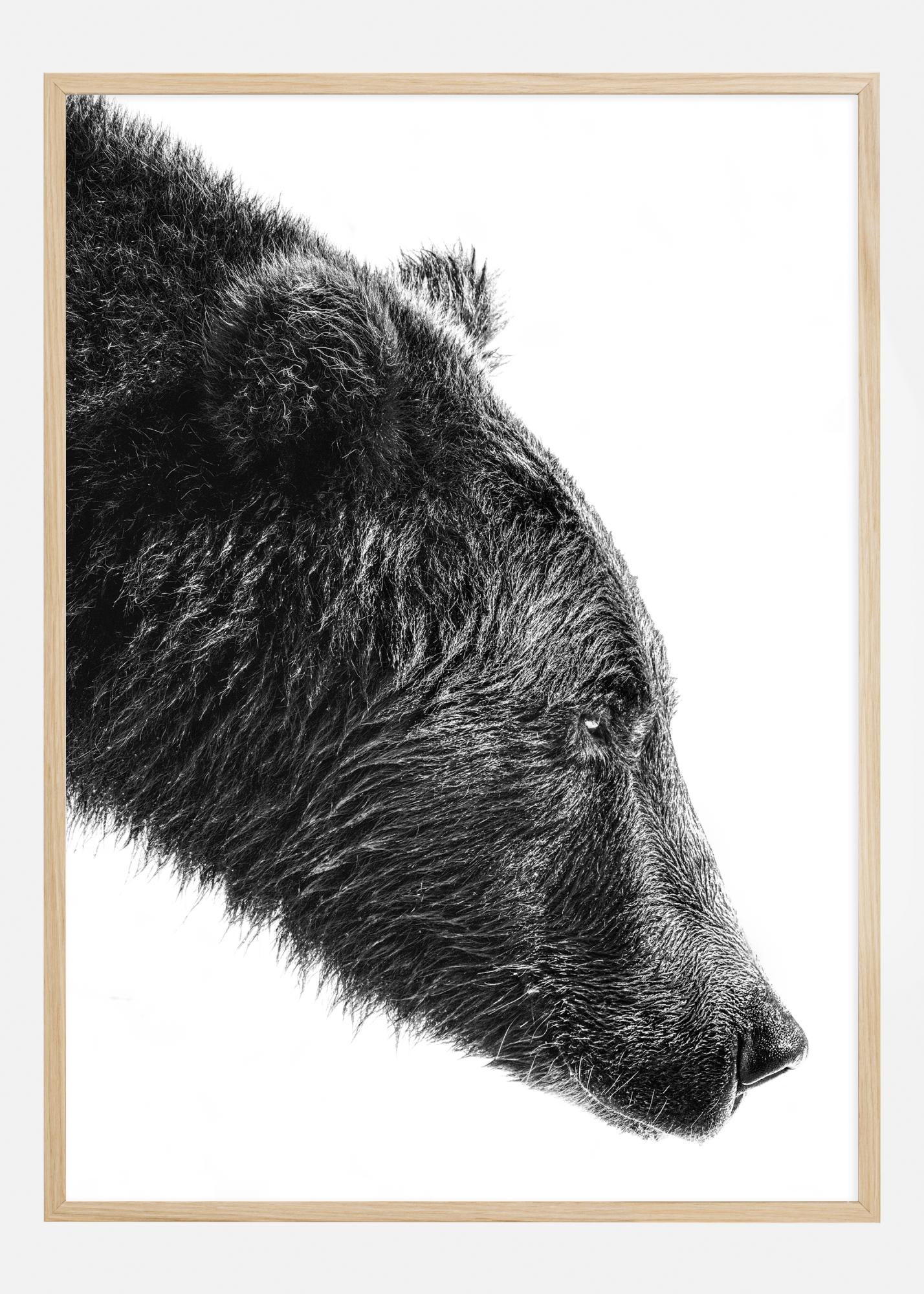 Тази стилна и мощна принт изобразява близък план на мечка в черно и бяло, мотив, който придава сурово и честно усещане за неукротимия дух на природата. Изображението е фокусирано върху профила на мечката, където всеки детайл от козината и спокойните очи изпъкват благодарение на контраста между тъмните и светлите тонове.