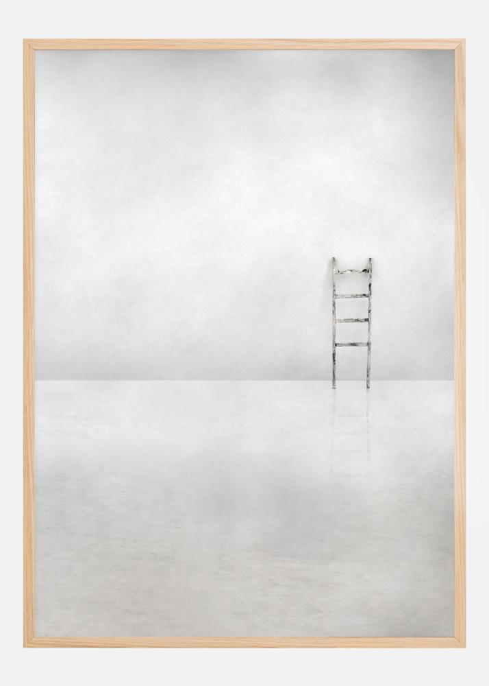 Един минималистичен постер с стълба, която се опира на бял фон. Тази самотна стълба, наречена социалната стълба, също е поставена на бял под. И стената, и подът са в същите бели и сиви тонове, което прави стълбата ясно очертана в по-тъмни тонове. Забавлявайте се, опитвайки се да интерпретирате значението на това изображение.