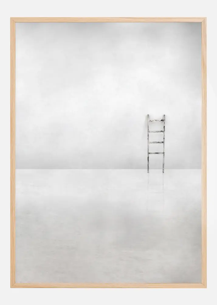 Минималистичен постер с стълба, наклонена към бял фон. Тази самотна стълба, наречена социалната стълба, също е поставена на бял под. И стената, и подът са в същите бели и сиви тонове, което прави стълбата ясно очертана в по-тъмни тонове. Забавлявайте се, като тълкувате значението на този образ.