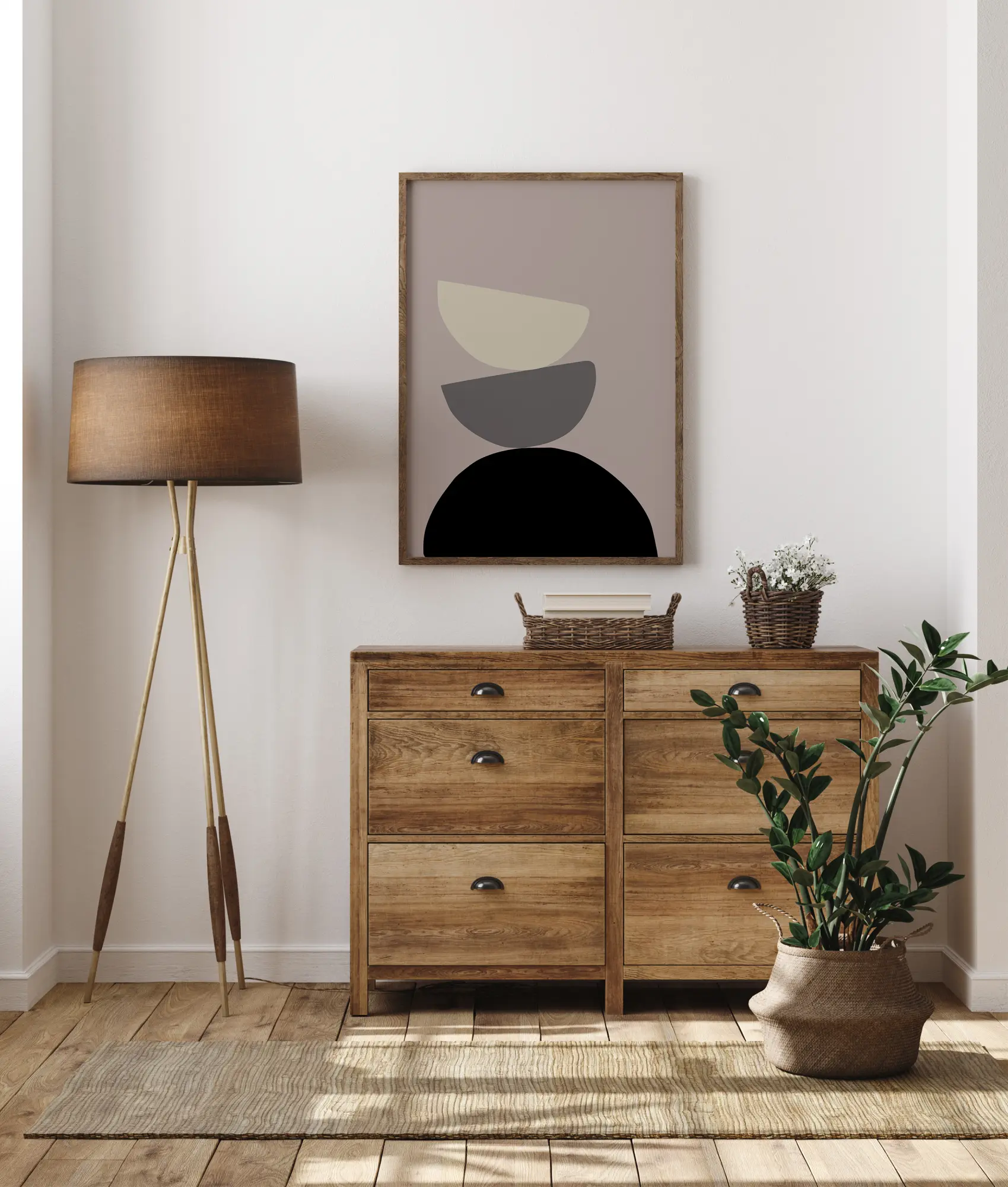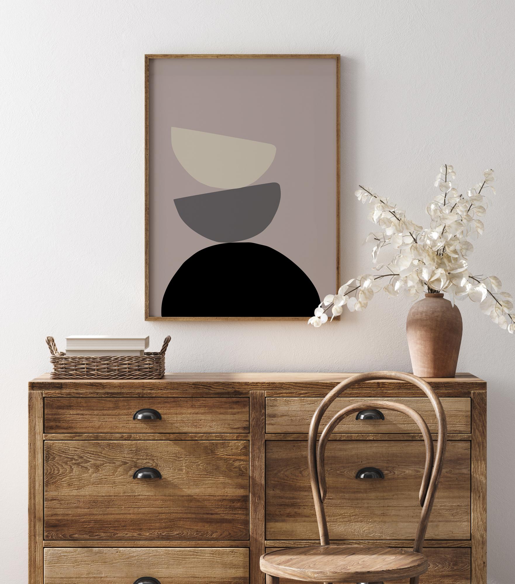 Абстрактен постер с три полукръга, подредени един върху друг на сив фон. Голям черен полукръг е най-отдолу, средно сив полукръг се балансира отгоре, като същевременно балансира бял полукръг по-нагоре. Създайте хладно настроение на синя стена или по-топло настроение на бежова или кремава.