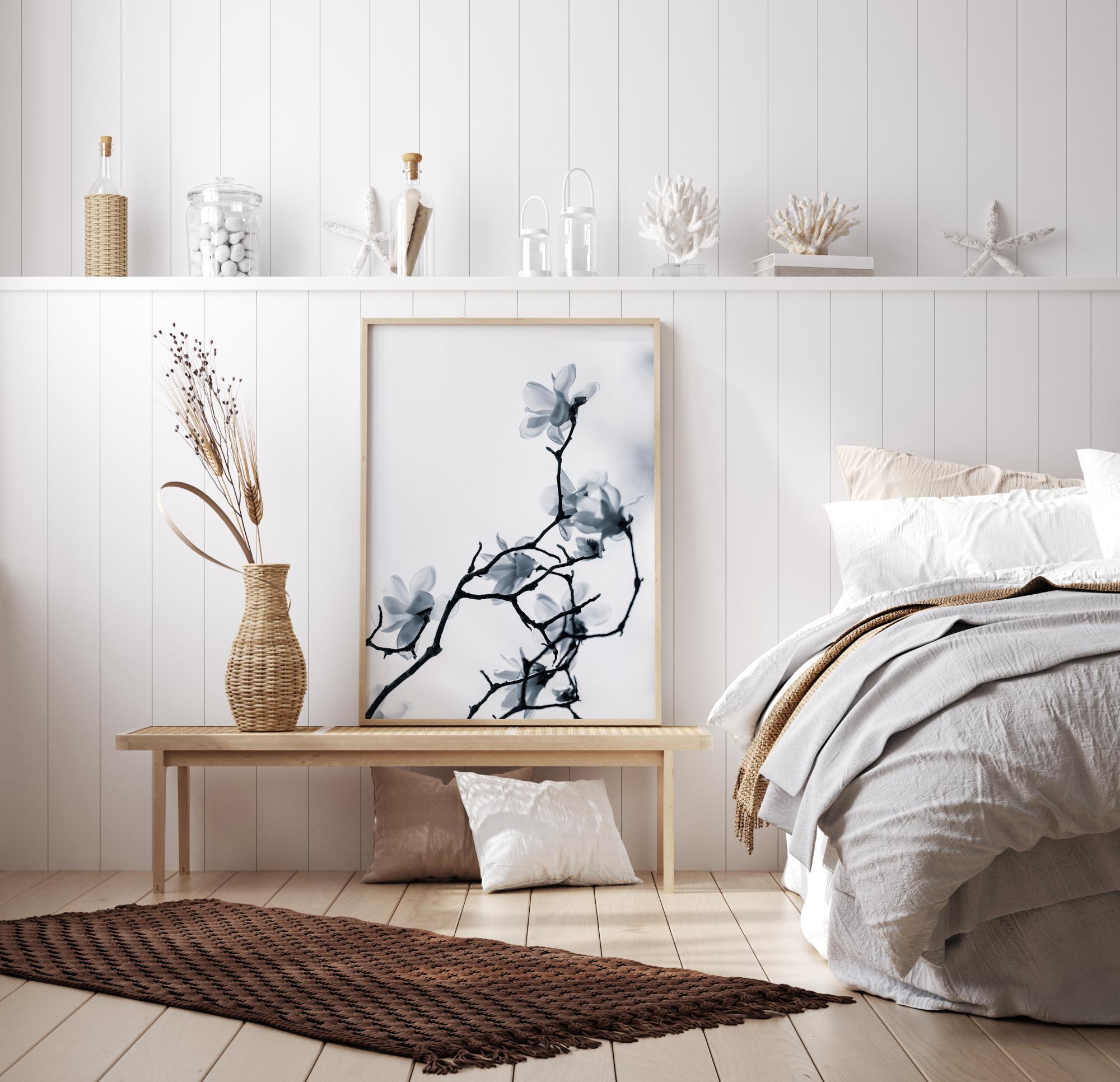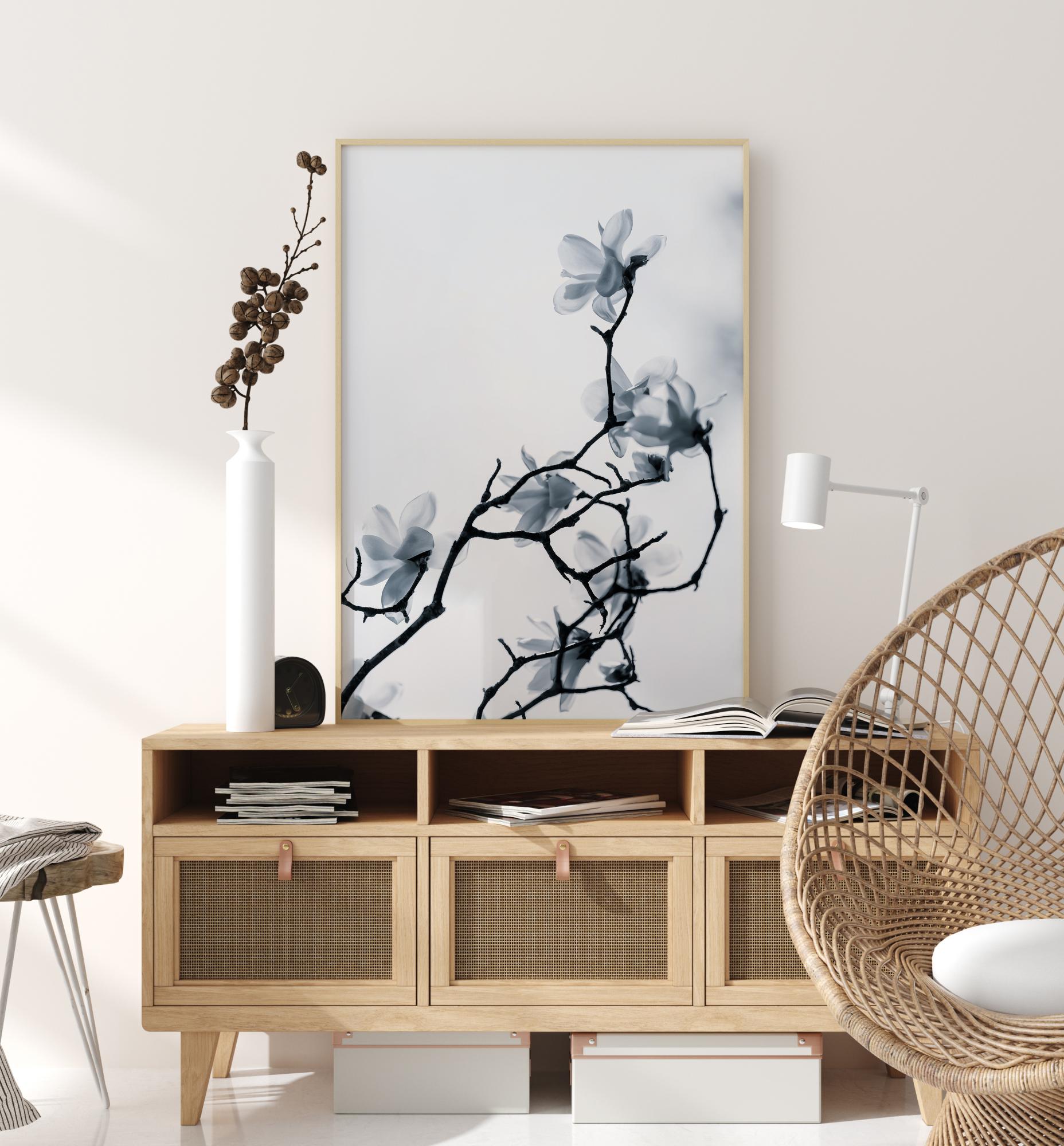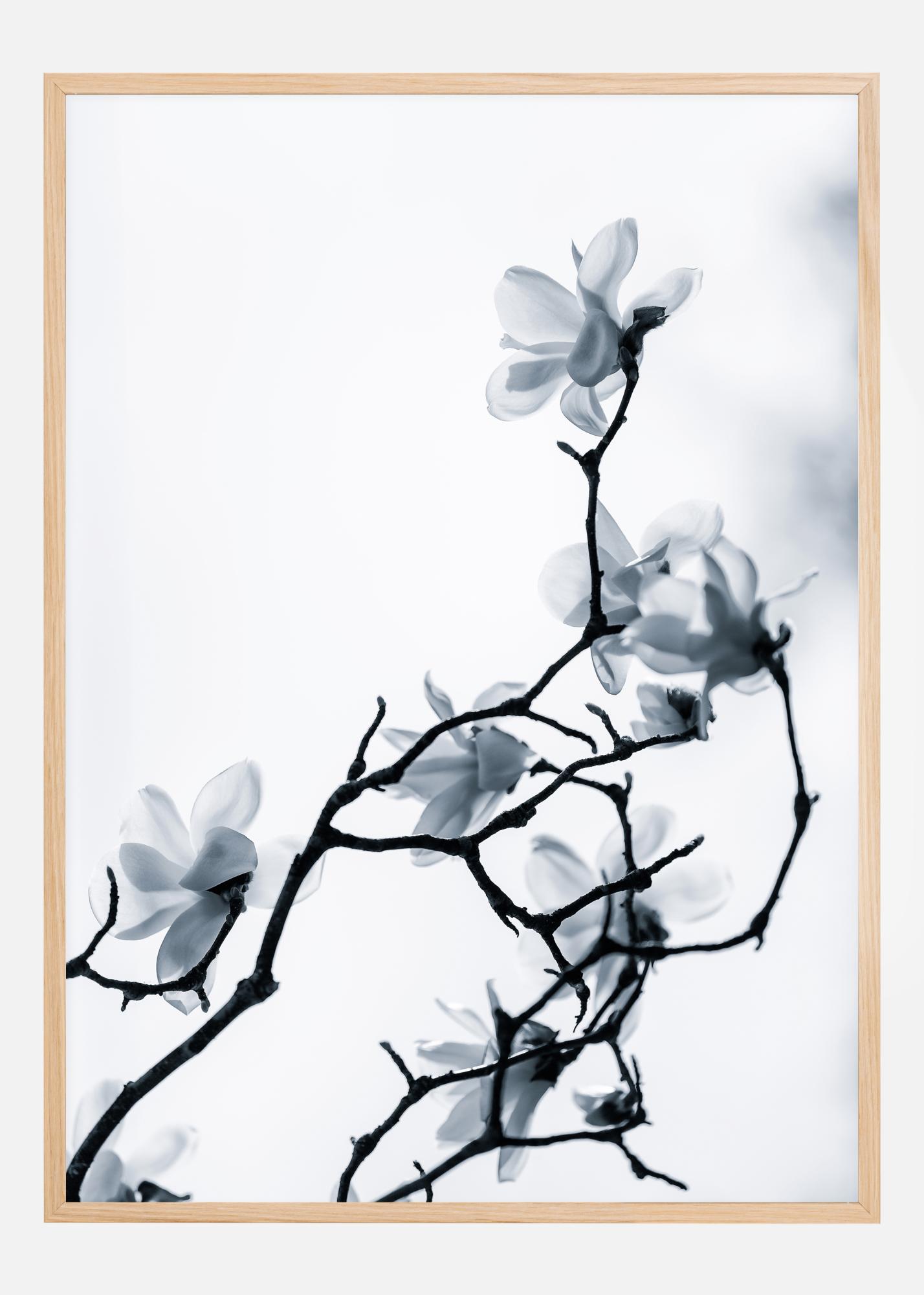 Постер с цветя и елегантно клонче, изпълнено с нежни цветове. Тънките клони са черни срещу бялото небе и се простират нагоре, всеки носещ меко бяло цвете. Спокойствие и уют излъчва тази картина, която би била подходящо допълнение за баня или опростена стена в коридор.