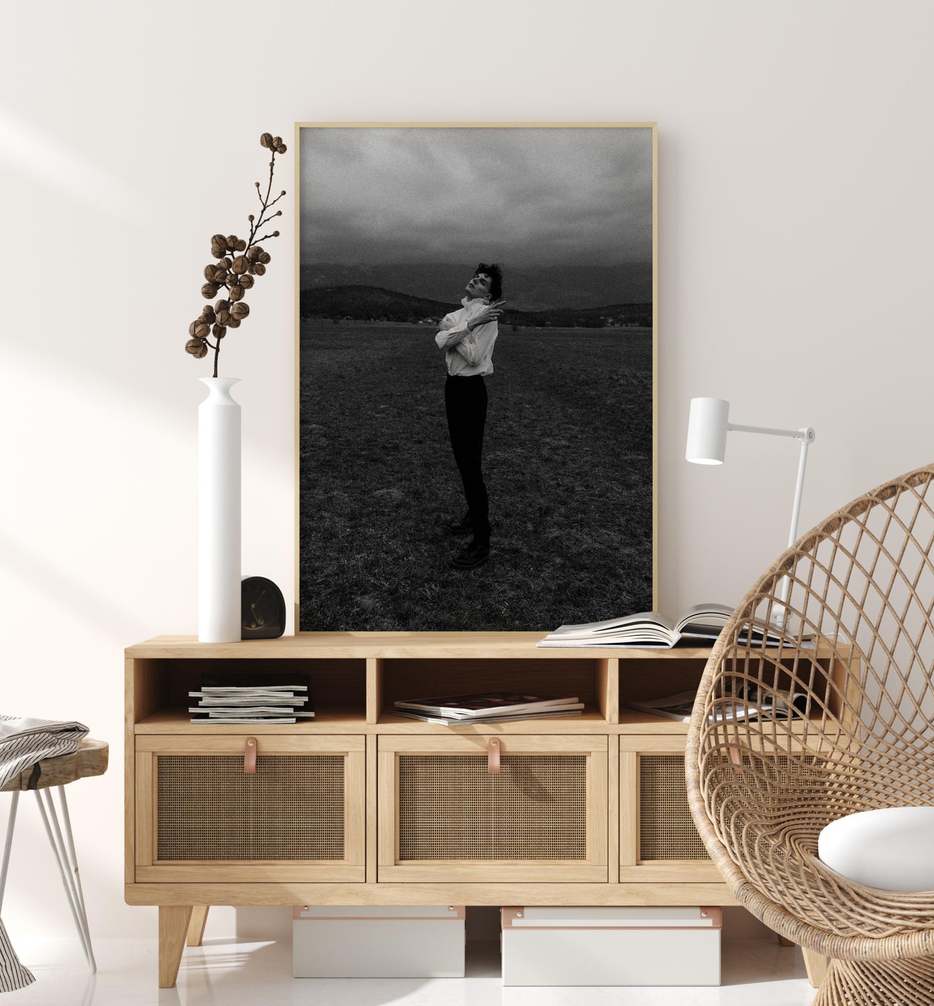 Портретен постер на безгрижен мъж в средата на открито поле. Фините черно-бели тонове придават естествено усещане. Насладете се на този личен момент, който е уловен завинаги, когато го окачите у дома.