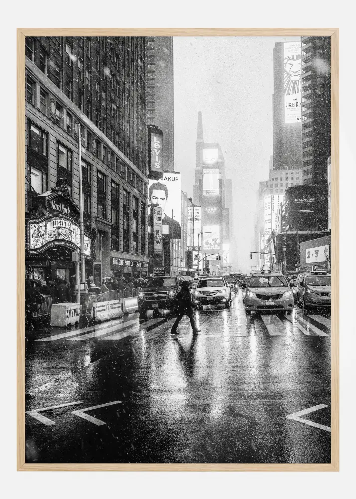 Градски плакат с Таймс Скуеър в Ню Йорк. На тази черно-бяла снимка човек пресича улицата през нощта под дъжда. Колите чакат да продължат да се движат. Ярките рекламни табели и небостъргачи се виждат в далечината, когато гледаш надолу по улицата. Атмосферата е осезаема, човек почти би могъл да бъде там сам.