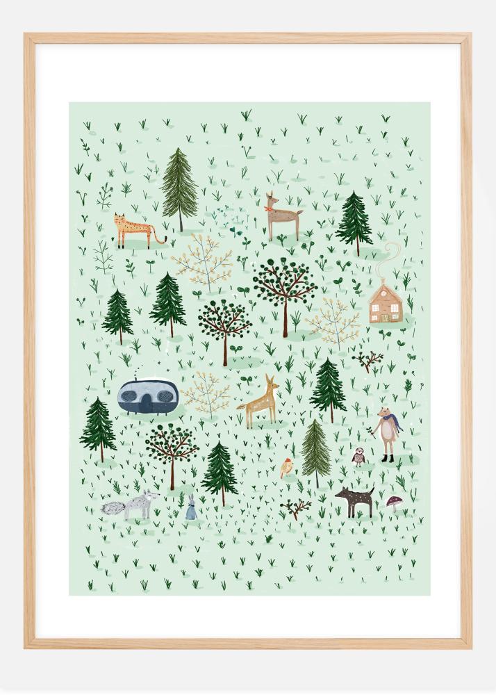 Забавен плакат с малка гора, основно изпълнена с различни животни. Това е графична рисунка с опростени дървета, животни и къщи, които са разпръснати. Нищо не е в мащаб. Има голяма изправена лисица с шал и ботуши, малка къща и масивна каравана. Това е кич, сладко и напомня на коледна картичка. Отличен плакат за всяка стая в дома.