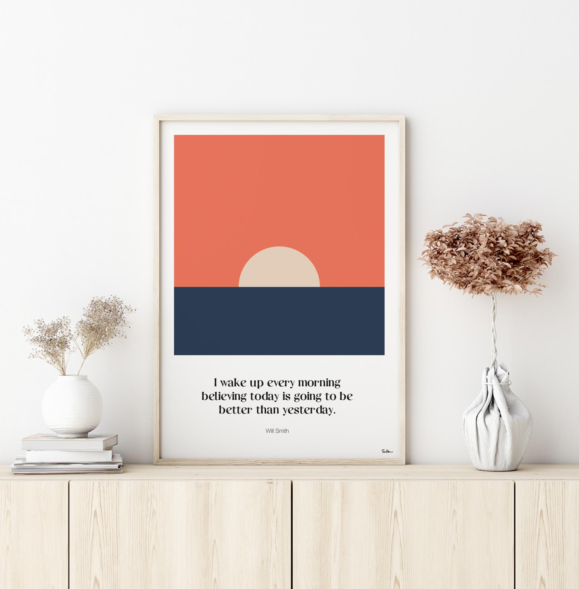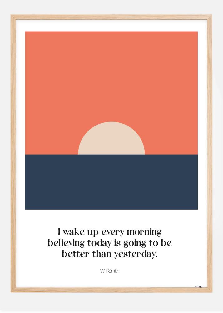 Текстов плакат с цитат на Уил Смит "Събуждам се всяка сутрин, вярвайки, че днес ще бъде по-добро от вчера," написан под графична илюстрация на изгрев. Стилен и елегантен плакат, създаден от Тим Хансън.