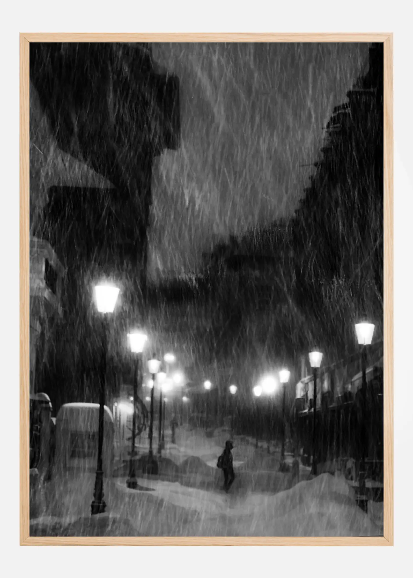 Класически постер с уличка, осветена от лампи през нощта, покрита със сняг. Още сняг пада отгоре в дебели ивици. Самотен човек пресича покрития със сняг път, за да стигне до редицата къщи отдясно. Лампите светят ярко и осветяват сцената във фантастична коледна картина.