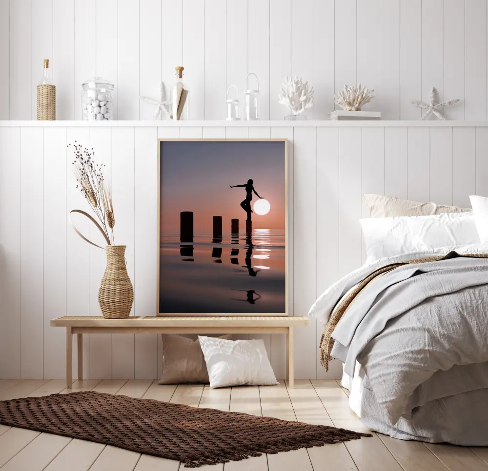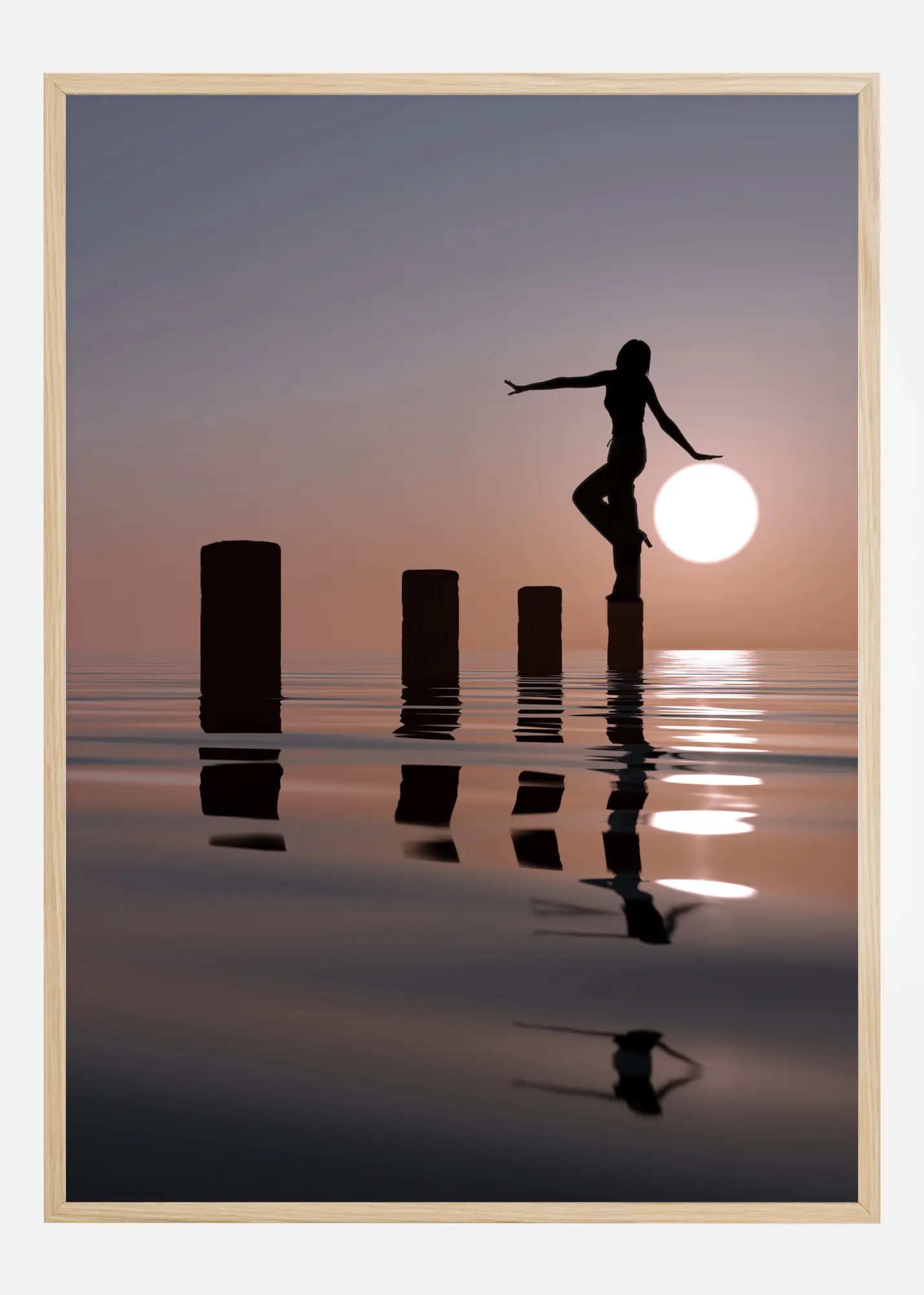 Ангелски постер с момиче, което балансира върху стълб в морето. Момичето и стълбовете са в силует, като тя стои на един крак. Една ръка се простира назад. Ъгълът на изображението създава впечатление, че тя почива ръката си върху залязващото слънце. Това, заедно с меките пастелни цветове, създава магическа вечерна картина за спокойна атмосфера.