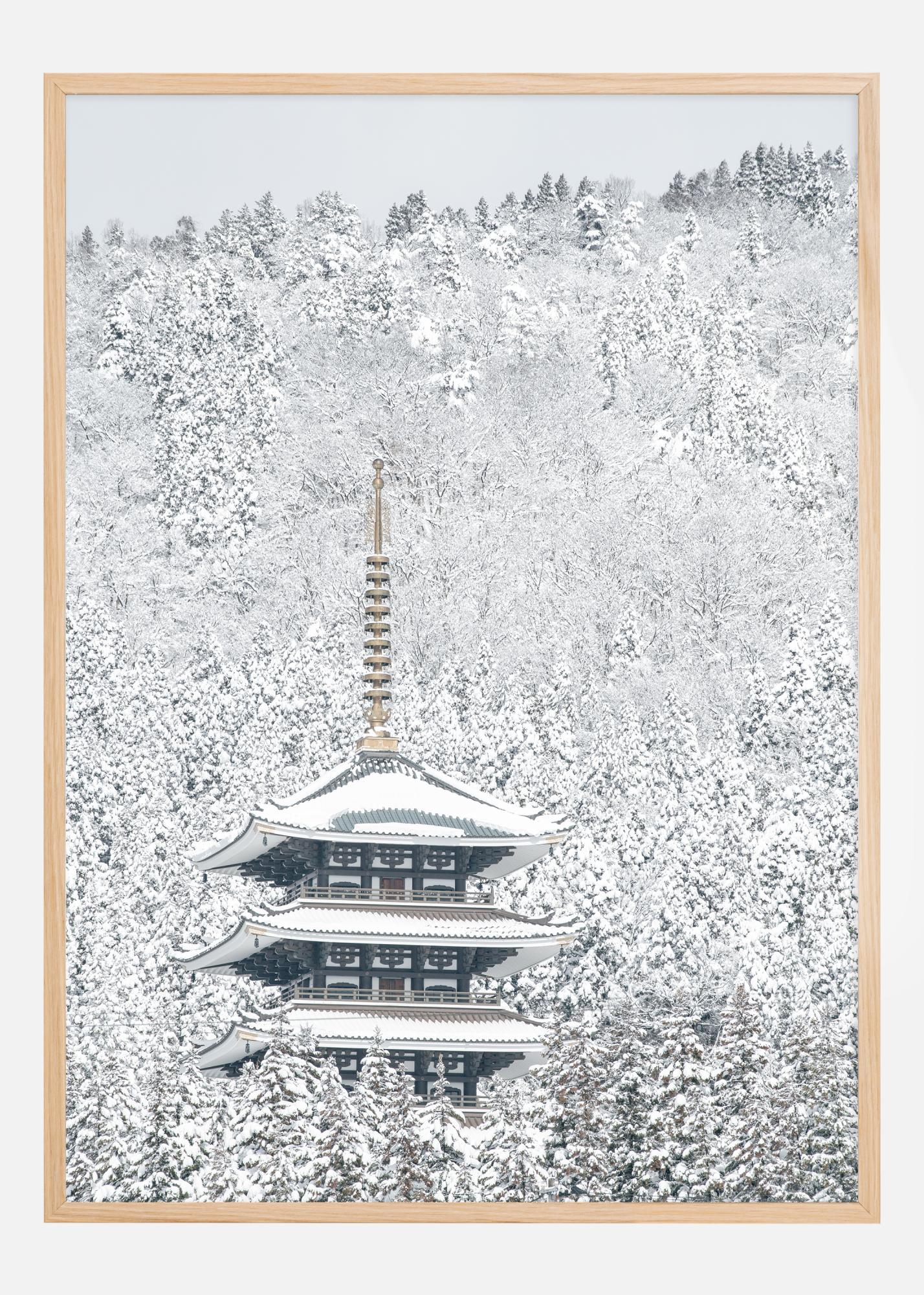 Този атмосферен постер предизвиква спокойното усещане за зимен пейзаж, където традиционна източноазиатска пагода стои величествено, заобиколена от море от дървета, покрити със сняг. Финият контраст между деликатната архитектура и мощните, пищни дървета, всички обгърнати в дебел слой сняг, създава образ на тишина и изолация. Този принт перфектно улавя самотната красота на зимната природа, където нюансите на бялото варират от силна, сияеща светлина до меки, приглушени тонове.