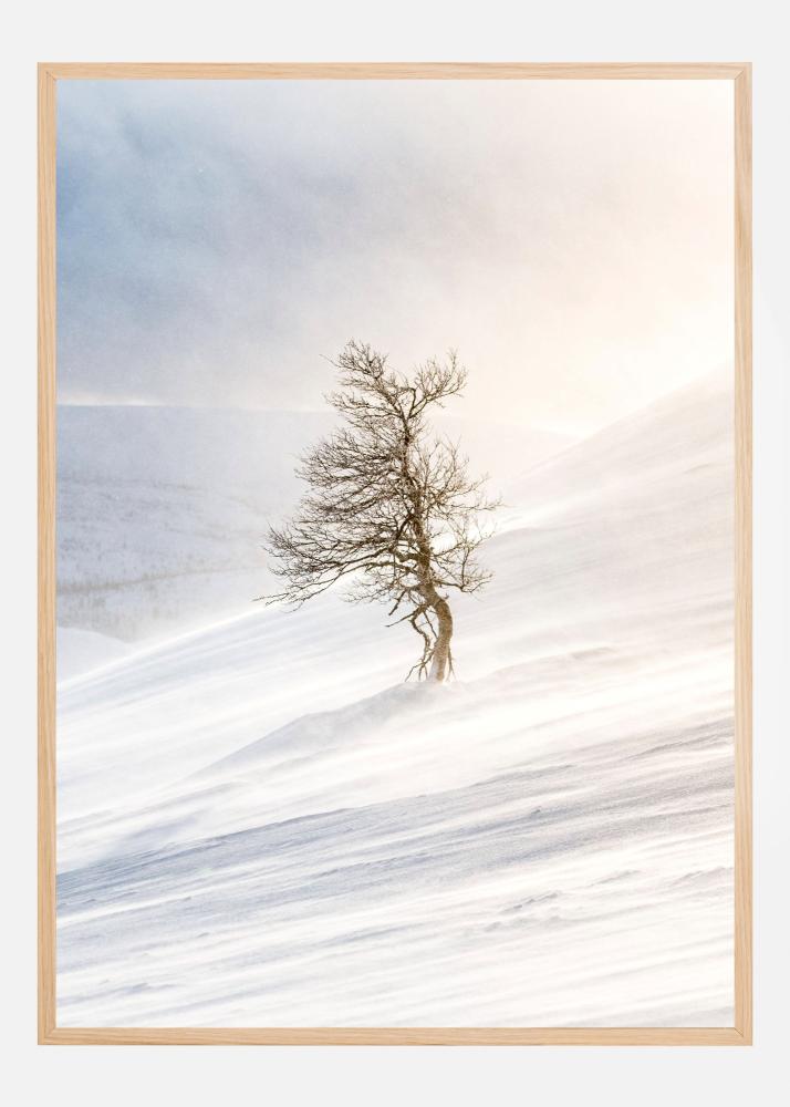 Този изпълнен с настроение постер изобразява самотно дърво в заснежен зимен пейзаж, където вятърът преминава над меки снежни преспи, а светлината създава мечтателно и спокойно усещане. Мотивът има минималистично излъчване, което го прави идеален като плакат или принт за модерни домове, скандинавски интериори и помещения, в които желаете да внесете хармония и тишина. Опростеният пейзаж улеснява съчетаването на изображението с други постери в стена с картини.