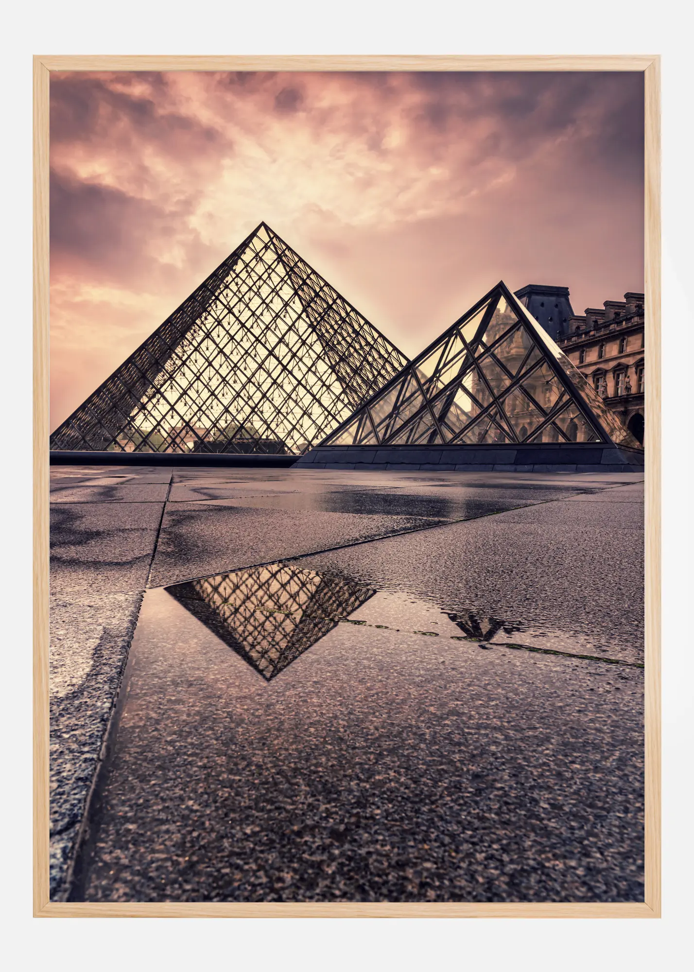 Този модерен постер изобразява емблематичните геометрични форми на известна структура, които се отразяват в локва вода. Металните триъгълници и стъклените панели са уловени в смела перспектива, с небе, боядисано в меки нюанси на лилаво и розово като последните светлини на здрача. Цветовата палитра варира от студени сиви и сребърни тонове до топли медни нюанси, което отразява както устойчивостта на конструкцията, така и преходната красота на небето.