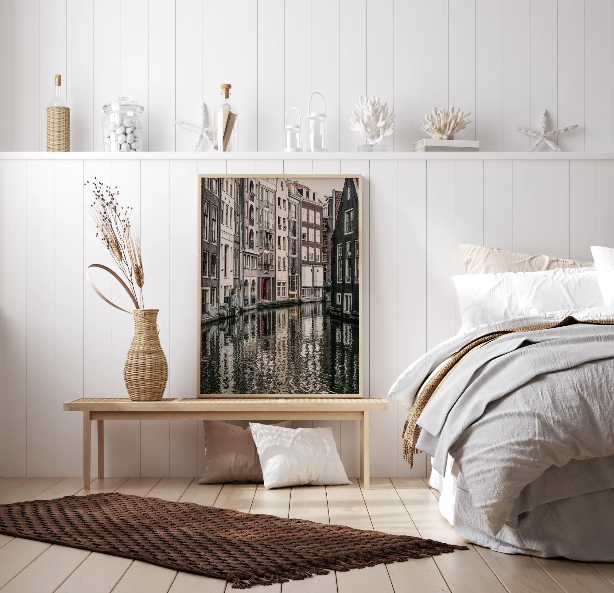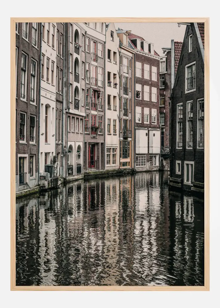 Постер на градски пейзаж с канал, който преминава през редици от високи градски къщи. Този сепиатонен печат има само няколко нюанса на червено и меки кафяви цветове, за да създаде фокусни точки. Къщите лежат на брега на водата и хвърлят своите сенки върху пенливата повърхност. Намерете подходящи бежови цветове за стената, за да направите цветовете на къщите по-ярки.