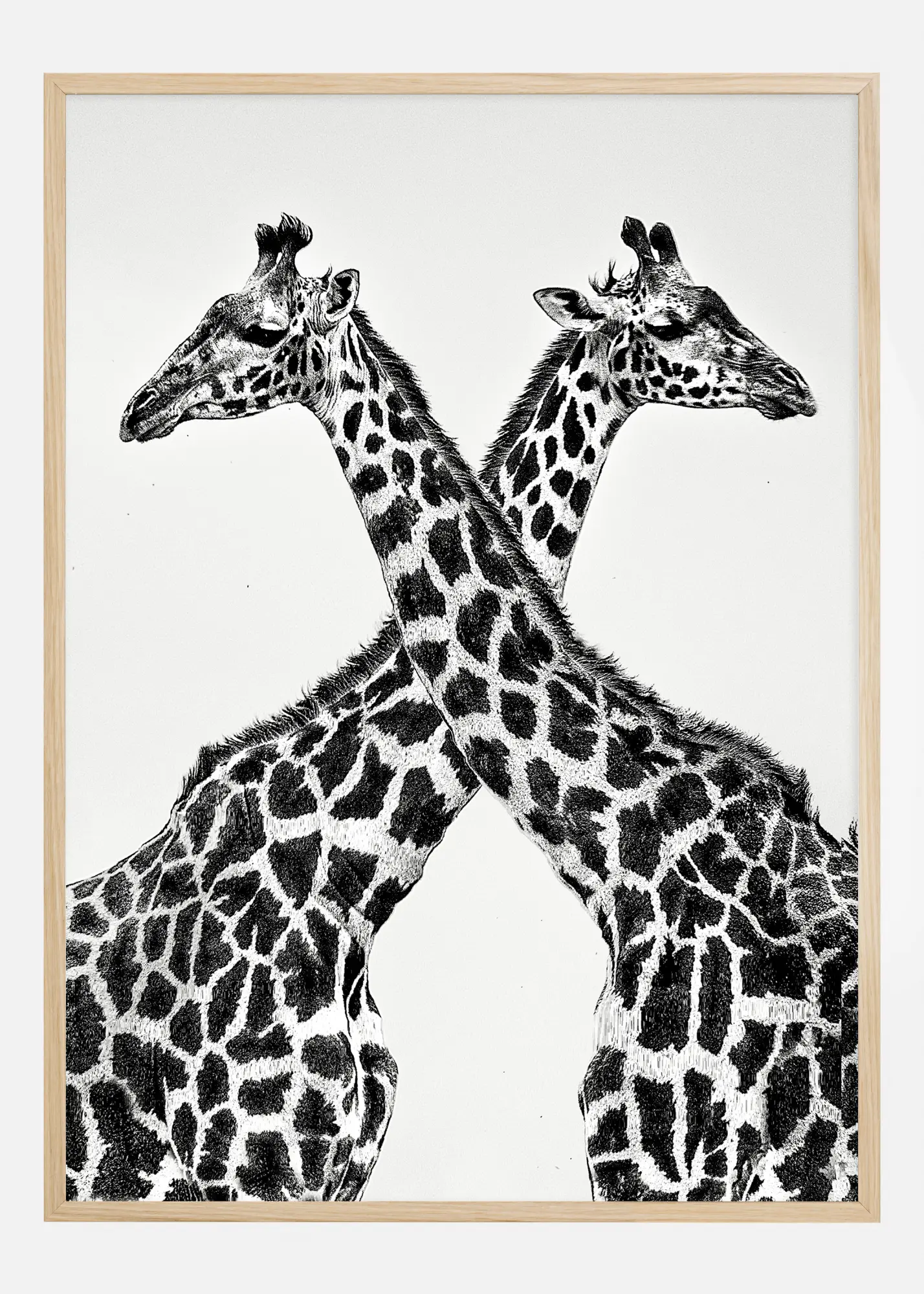 Този плакат не е просто почит към красотата на жирафите, но и изследване на контраст и форма. Перфектен за любителя на природата и събирача на изкуство, този принт ще създаде завладяваща фокусна точка във всяка стая. Изображението е затворено в дискретна рамка от дъб, която добавя топъл тон към черно-бялото изображение, но имайте предвид, че именно мотивът вътре в рамката е истинската звезда. Този плакат би могъл да бъде начален разговор и обичано допълнение към вашата колекция от стенни произведения на изкуството.