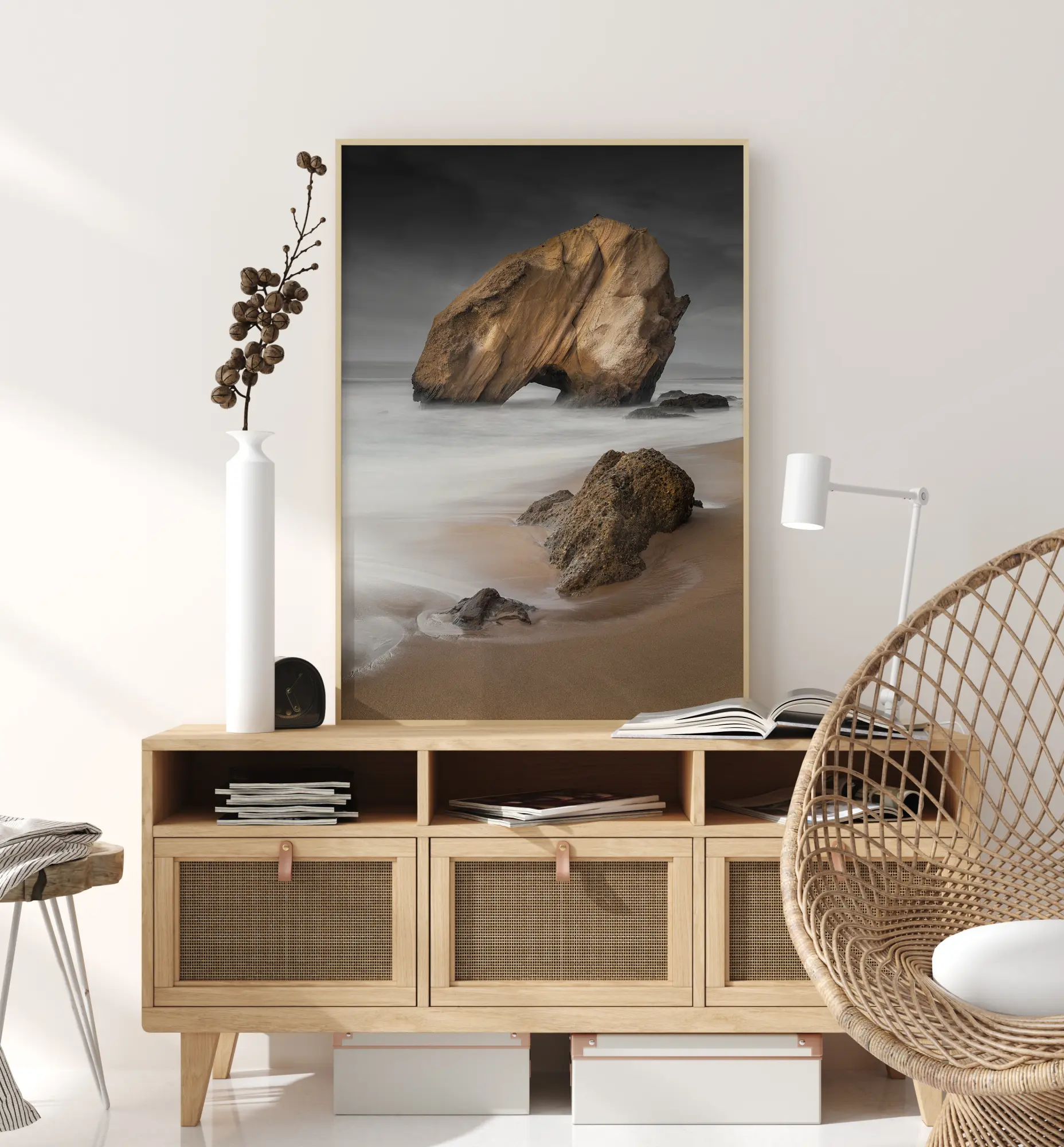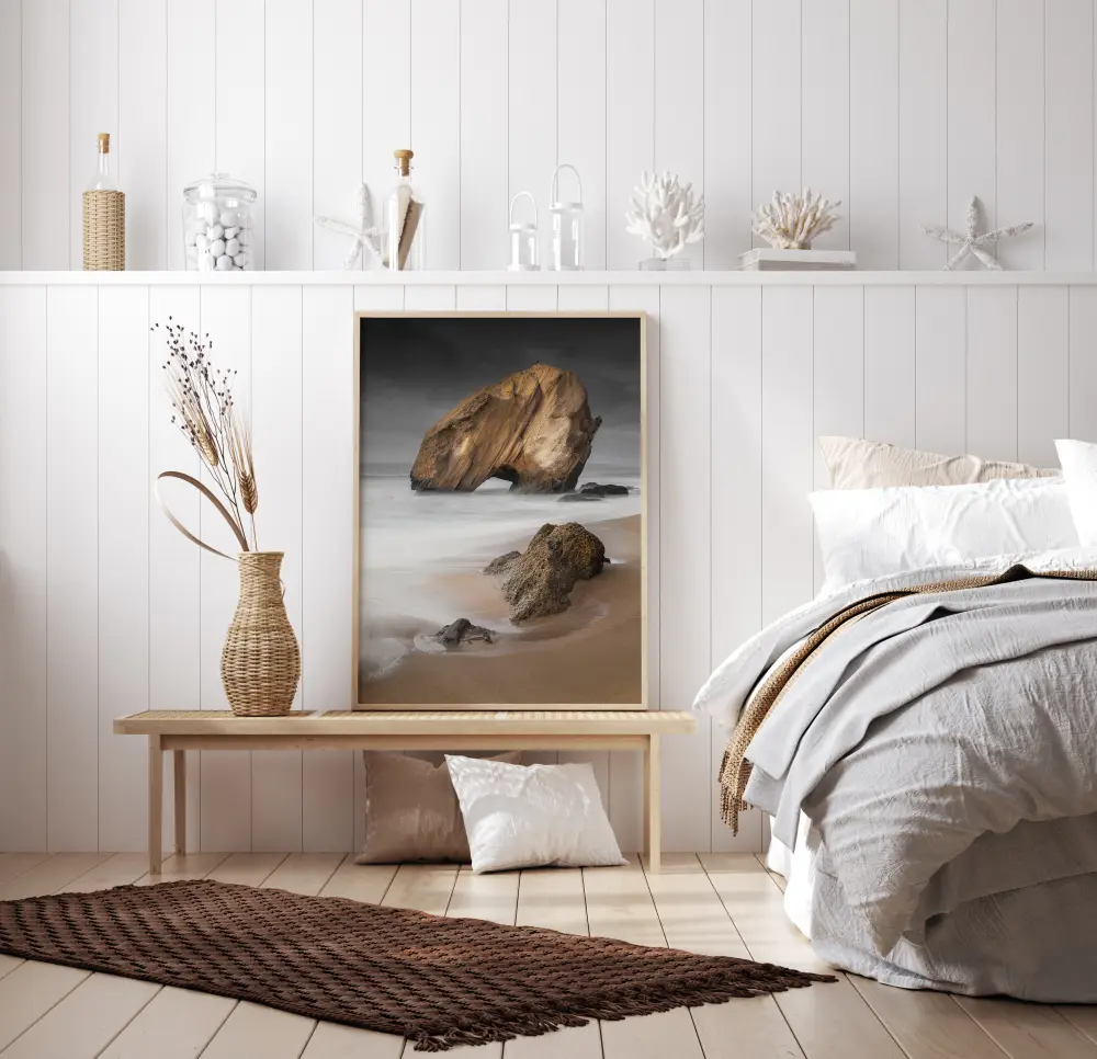 Драматичен плакат с плаж и скали под бурно небе. Белите морски вълни се въртят към плажа около солидна пясъчна скала в средата на морето. Мекият и неясен образ потиска потенциалната буря и създава по-спокойна атмосфера във вашия дом.
