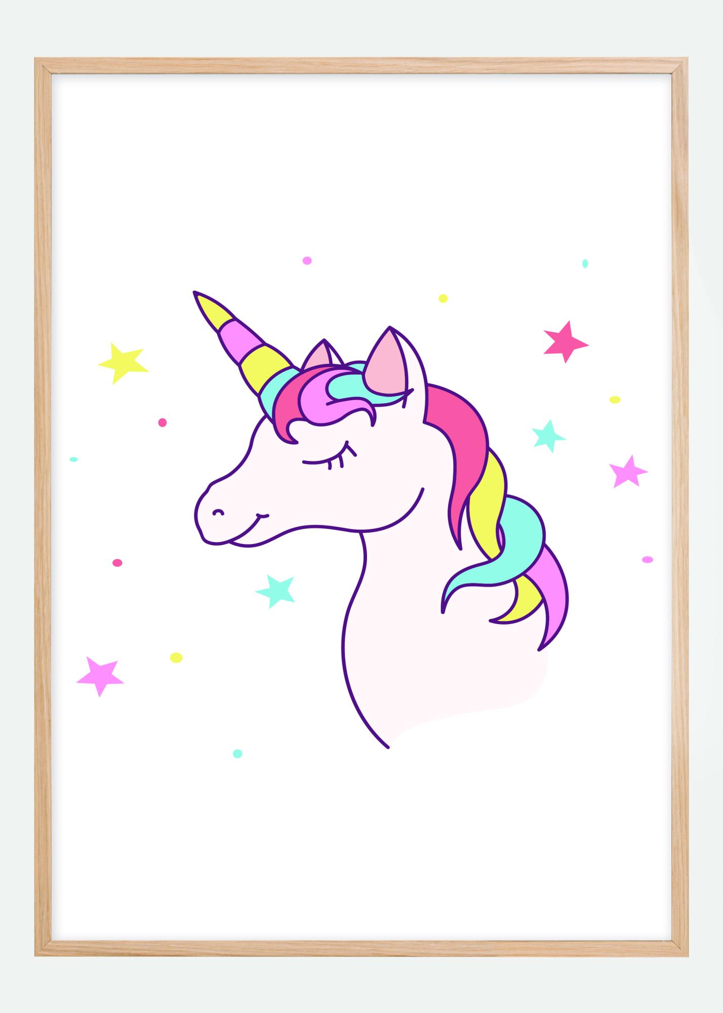 Една интересна постер с еднорог със затворени очи на бял фон. Еднорогът има жълта, синя и розова грива и рог. Има също звезди в същите цветове, които са разпръснати отзад и създават сладка магическа картина. Тя е перфектна за детската стая, тъй като е проста забавна рисунка.