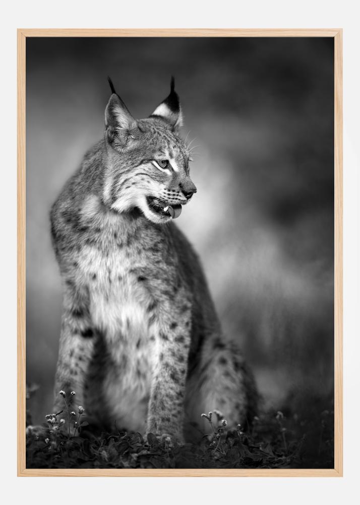 Плакат на тема дивата природа с рис, който седи в тревата. Котката гледа надясно в изображението и може би вижда потенциална плячка. Светлите петна по козината и пискюлите на ушите изпъкват с ясни детайли. Закачете този черно-бял печат на зелена стена за естествено усещане.