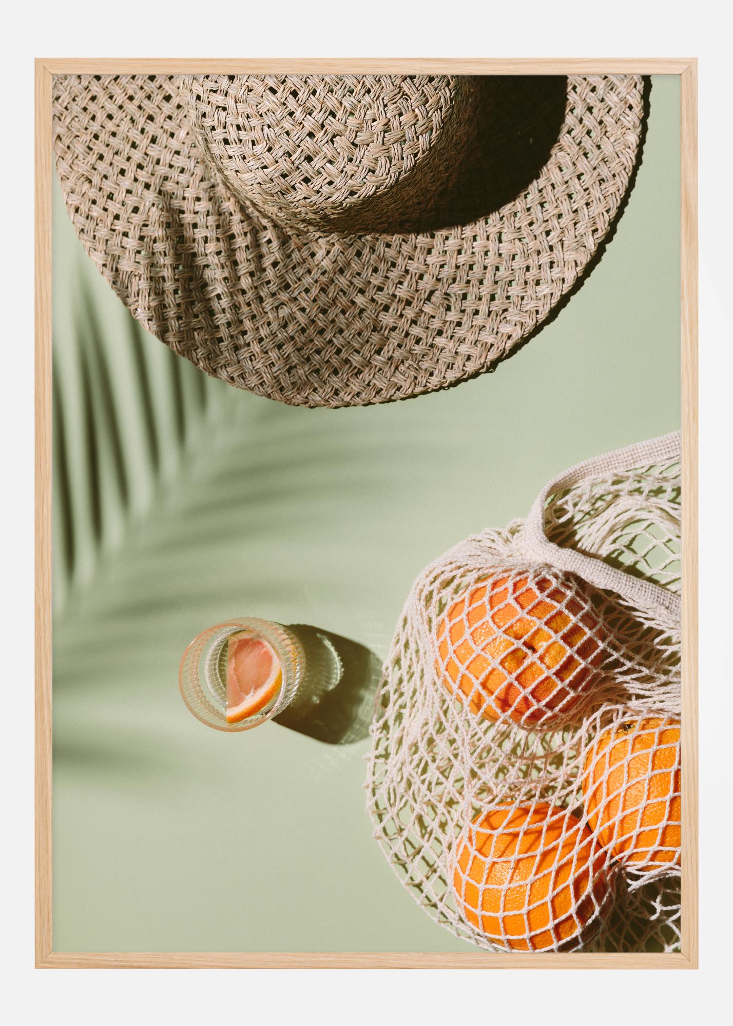 Този прекрасен летен постер улавя същността на ваканционното настроение с управление на изображения, което е както релаксиращо, така и освежаващо. Плетена шапка и мрежеста чанта, пълна със зрели под слънцето портокали на фона на успокояващи зелени нюанси, предават веднага усещането за мързеливи дни на слънце. Образът веднага предизвиква асоциации с топли климати, свежи плодове и време за отдих. Това е чудесен избор за всеки, който иска да внесе малко от това приятно ваканционно усещане в дома или на работното си място.
