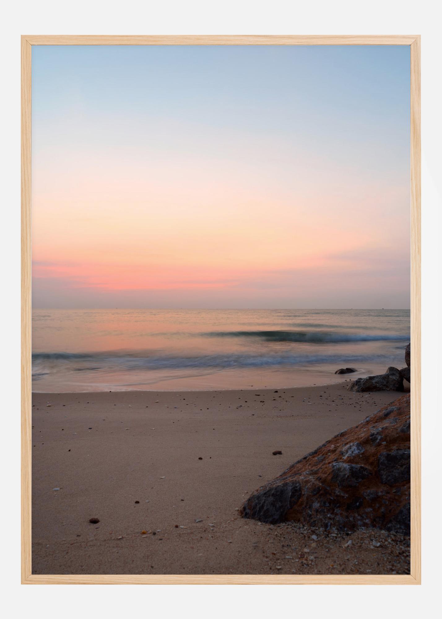 Постер с широка пясъчна плажна ивица и спокойно море в далечината. Меко изгреващо слънце се показва над хоризонта и хвърля мек розов и син оттенък върху морето. Усетете ваканционното настроение с тази тиха и спокойна плажна сцена.