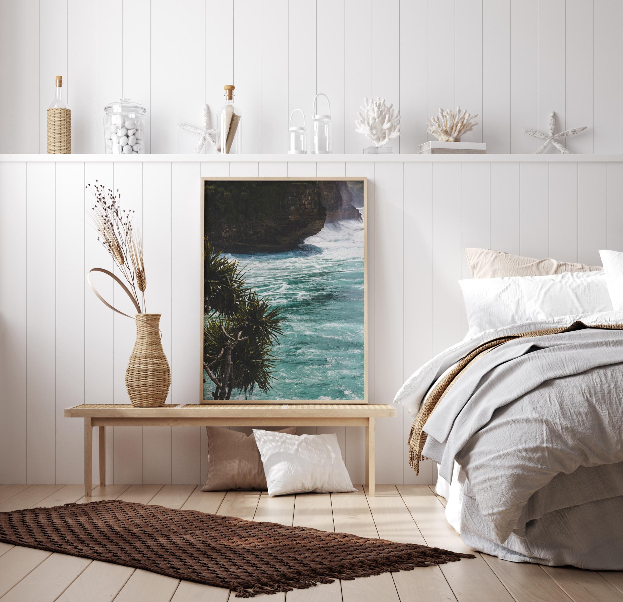 Тропически постер с море, което се разбива в основата на скалите. Група палми се люлеят на вятъра вляво от изображението, за да придадат по-екзотично усещане. Усетете топлината в тази светлосиня сцена и си представете вашата перфектна почивка.