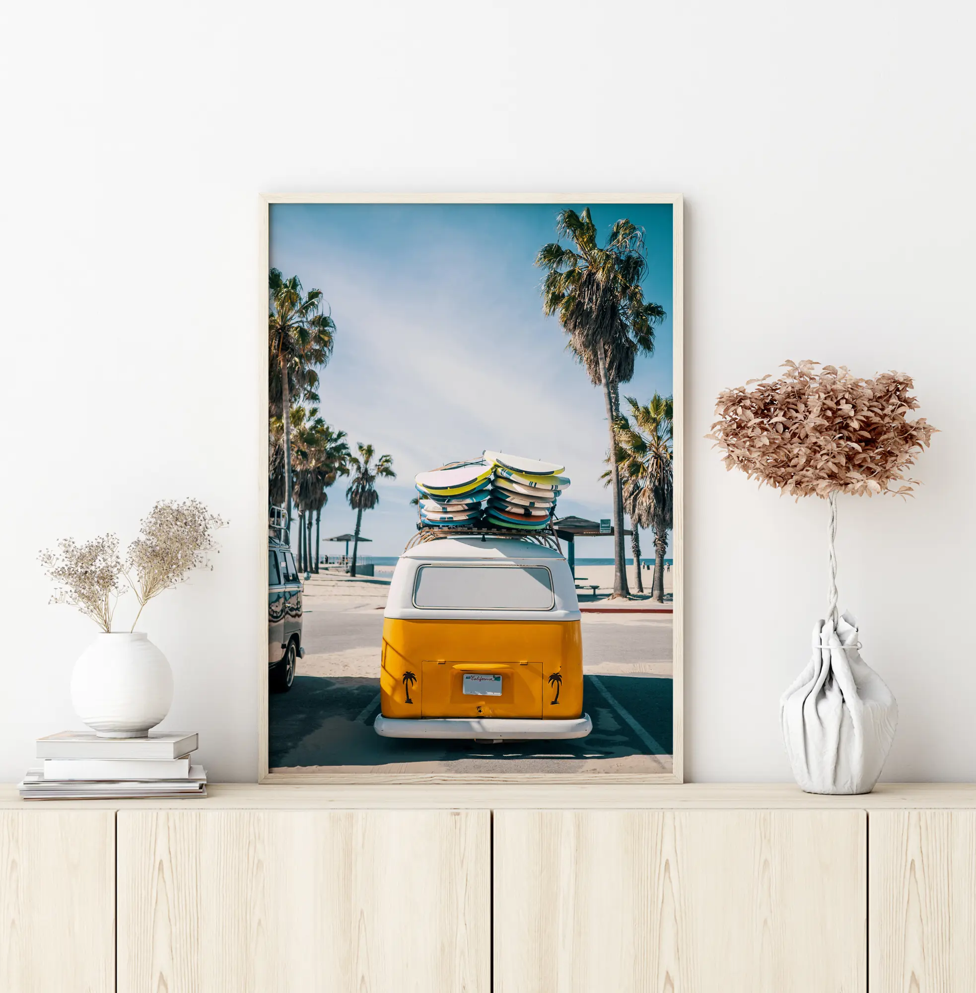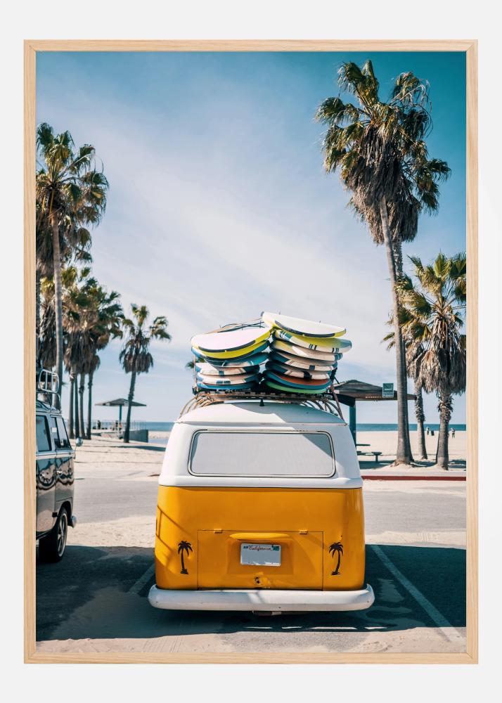 Забавен постер за ваканция с жълт кемпер, паркиран на паркинг близо до плажа. Палмите обграждат паркинга, за да създадат ваканционна атмосфера. Светли слънчеви лъчи огряват сцената и създават усещане за хубав топъл летен ден, идеален за бърз сърф в морето с една от сърф дъските на автомобила.