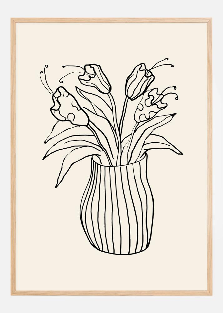 Стилизиран постер с цветя във ваза. Силните, смели черни линии грубо изобразяват цветята във вазата. На бял фон цветята изпъкват ясно. Добавете малко допълнителен цвят към изображението, като го окачите на светла, смела стена.