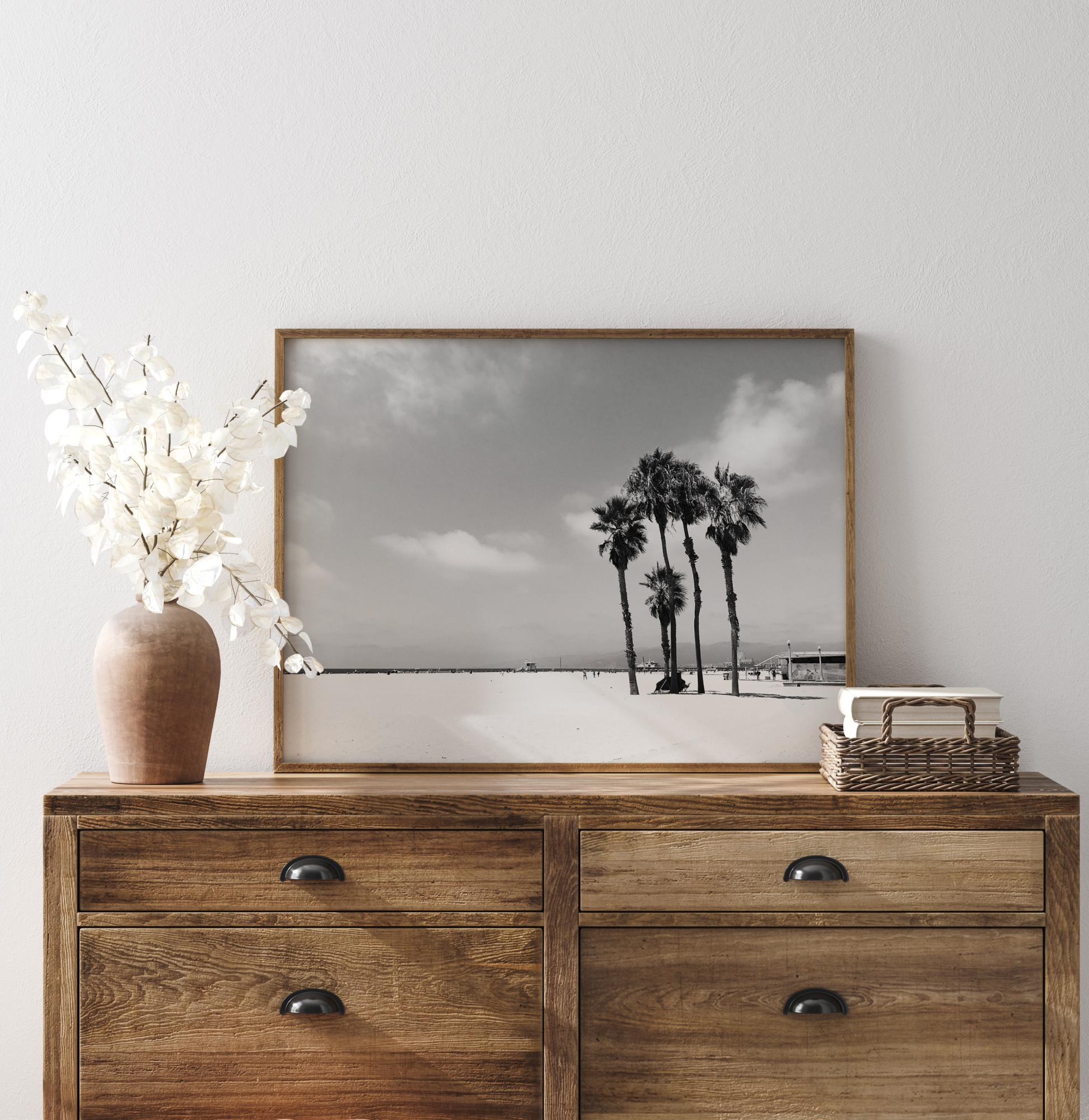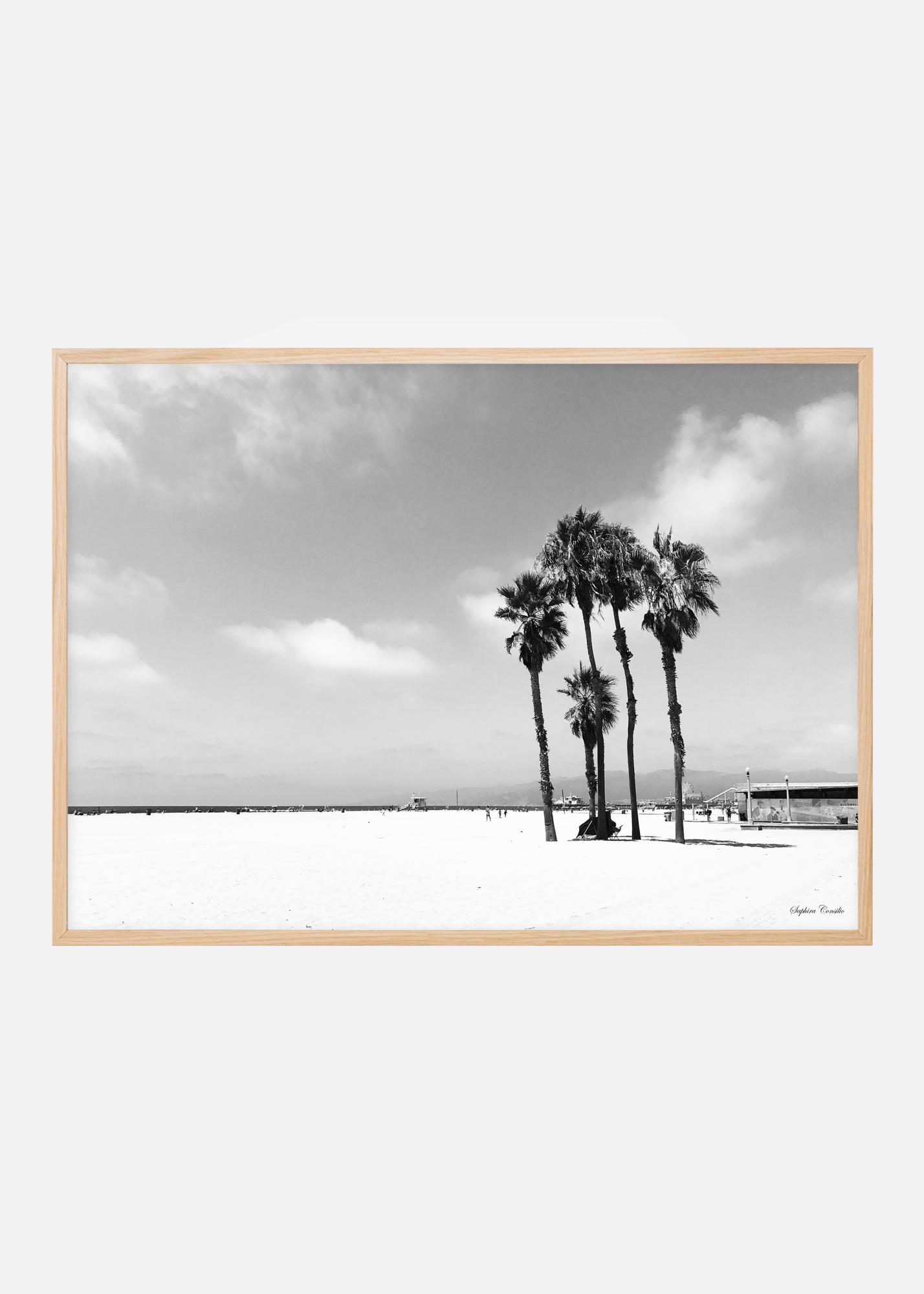 Тук фотографката Сафира Консилио ни отвежда до белия плаж във Венеция. Тук хората споделят мястото с красиви палми, увеселителни паркове и спасителни кули на спасителите. Елегантен черно-бял постер в хоризонтален формат.