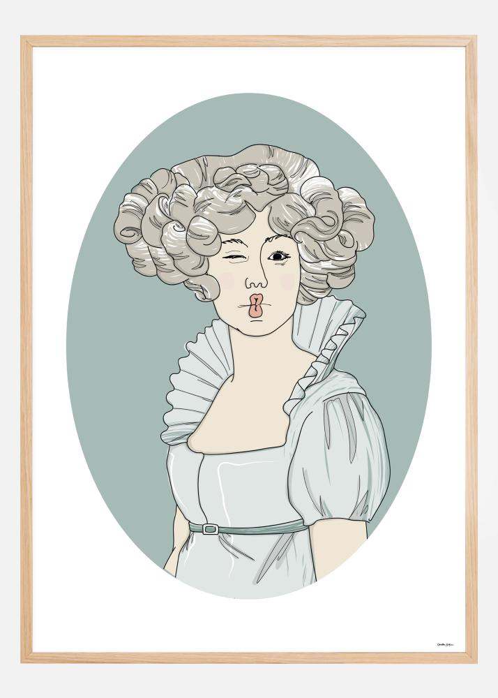 Дръзък постер с викторианска Виолетта, която небрежно намига от картината със сбръчкани устни в целувка. Нейните сиви къдрици съвпадат с меката синьосива рокля с висока яка. Картината също е в син овал, за да наподоби старите малки медальонни снимки и да създаде уникално, странно произведение на изкуството.
