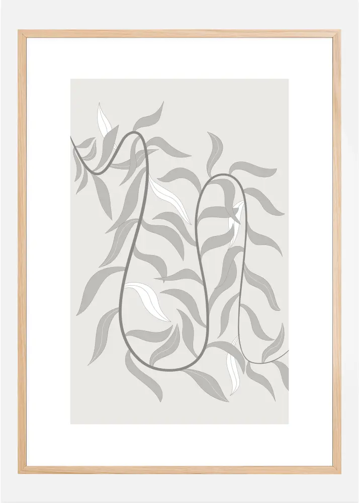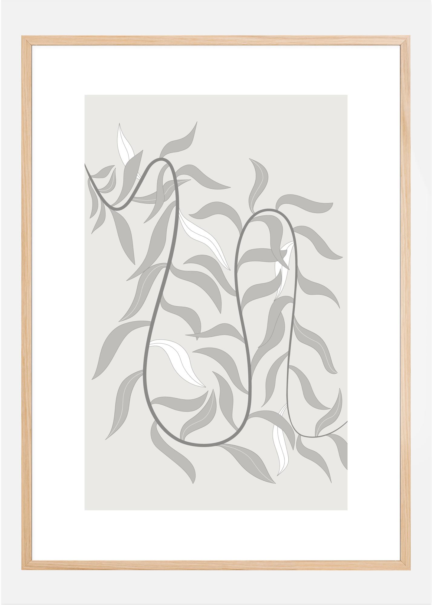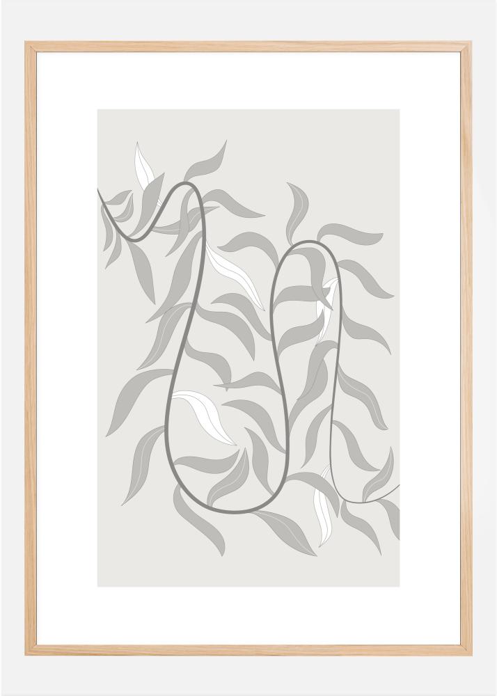 Абстрактен ботанически постер с пълзяща лоза, която се извива по постера. Дизайнът е в прост печатен стил с листа в светлосиво и бяло. Тъмносива лоза се усуква между листата и обединява всичко в извита форма. Комбинирайте с мека зелена стена, за да получите ефект на листа.