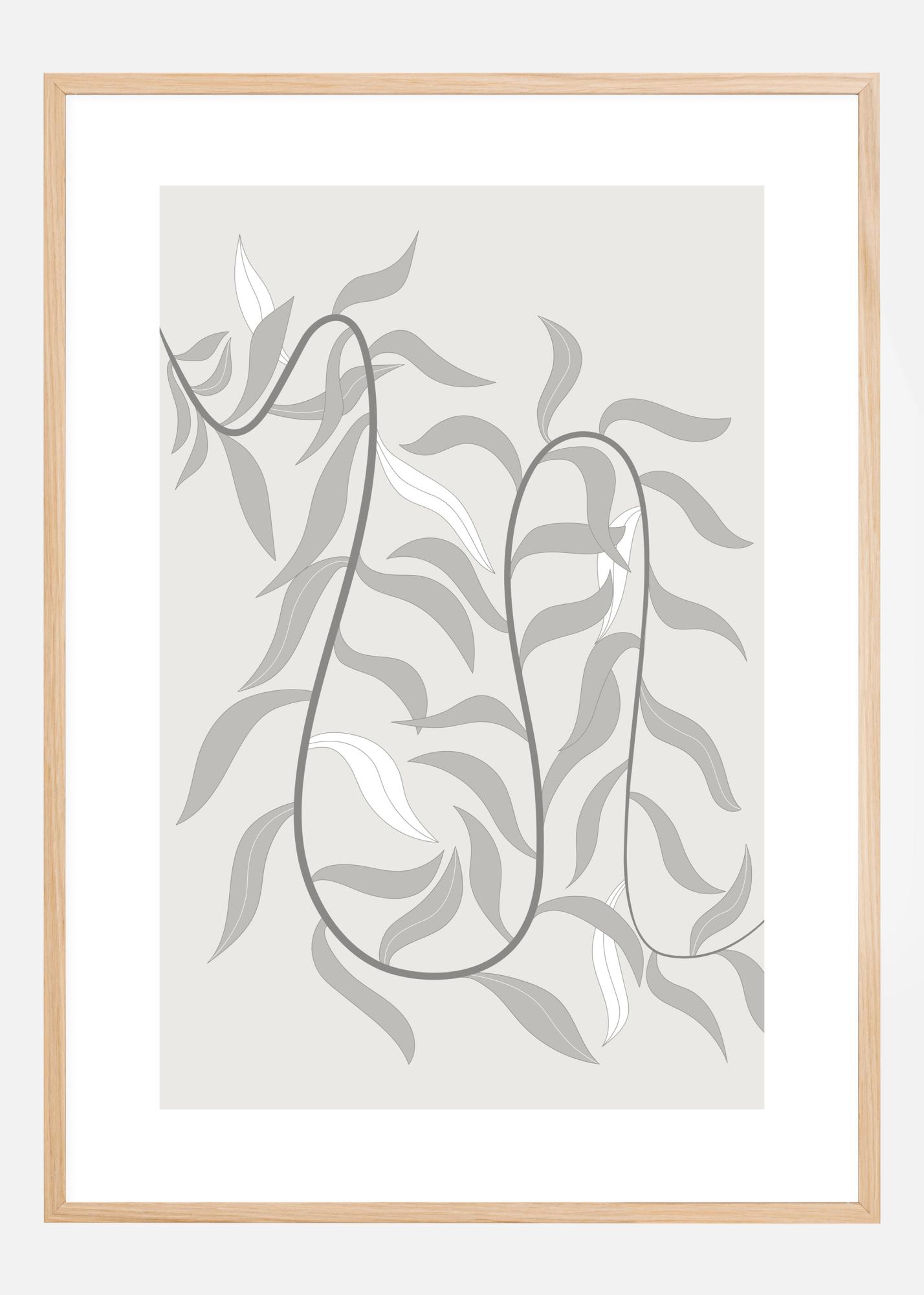 Абстрактен ботанически постер с пълзяща лоза, която се извива по постера. Дизайнът е в прост печатен стил с листата в светлосиво и бяло. Тъмносивата лоза се извива между листата и обединява всичко в извита форма. Комбинирайте с меко зелена стена, за да създадете листов ефект.