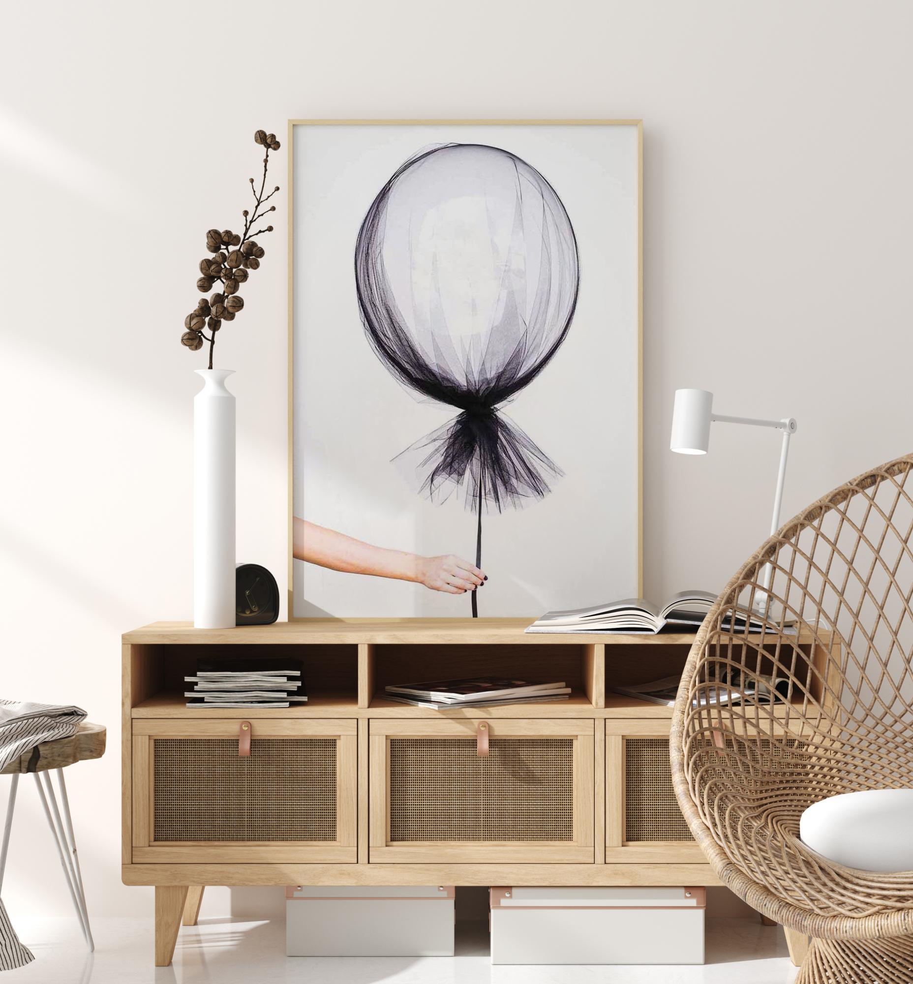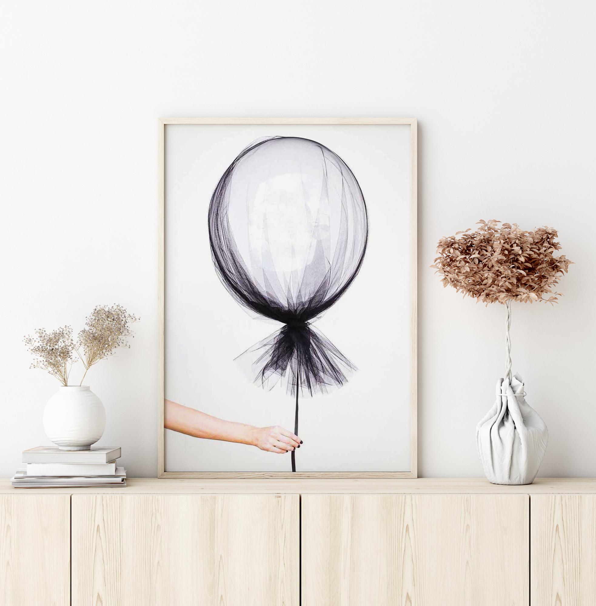 Елегантно фотографско изкуство на ръка, която държи плаващ балон, обвит в тънка прозрачна материя. Очарователен постер, който диша прекрасно съчетание от лекомислено игриво и нежно и крехко. Подходящ както за детската стая, така и за съвременния дом.
